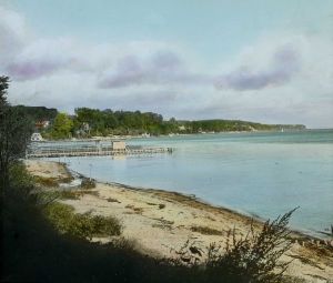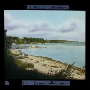 Titel hentet fra original dias. Billedet er håndkoloreret og stammer fra lysbilledserie nr. 2 benævnt "Øerne". På dias er påsat labels: "V. Richter. København." og "131. Svanemøllebugten.". I serien er 49 lysbilleder. Firmaet V. Richter producerede, kuraterede og distribuerede lysbilledserier i primært 1920'erne og 1930'erne. Dias måler ca. 8 x 8 cm.
