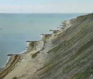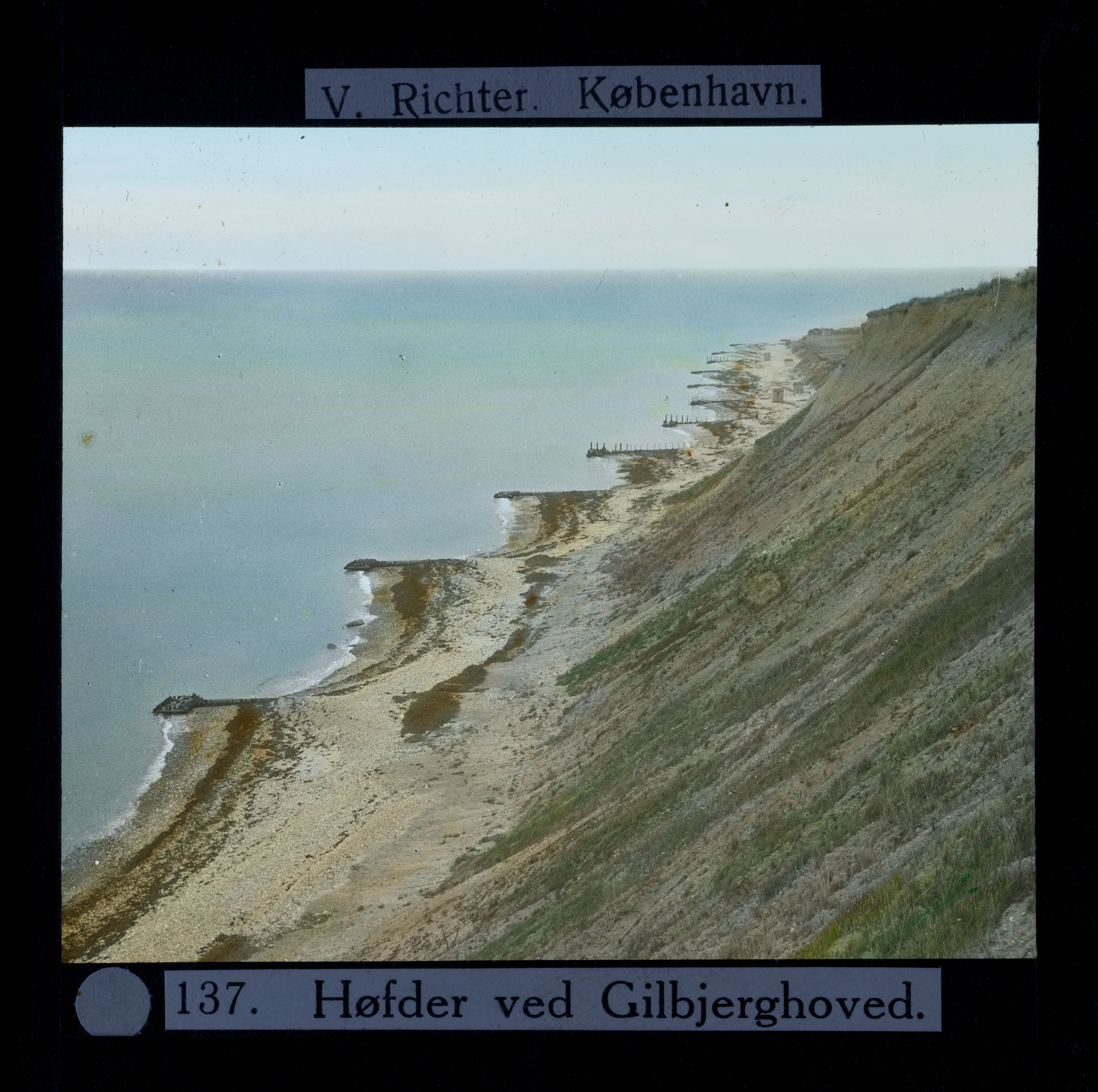 Billedet er håndkoloreret og stammer fra lysbilledserie nr. 2 benævnt "Øerne". På dias er påsat labels: "V. Richter. København." og "137. Høfder ved Gilbjerghoved.". I serien er 49 lysbilleder. Firmaet V. Richter producerede, kuraterede og distribuerede lysbilledserier i primært 1920'erne og 1930'erne. Dias måler ca. 8 x 8 cm.