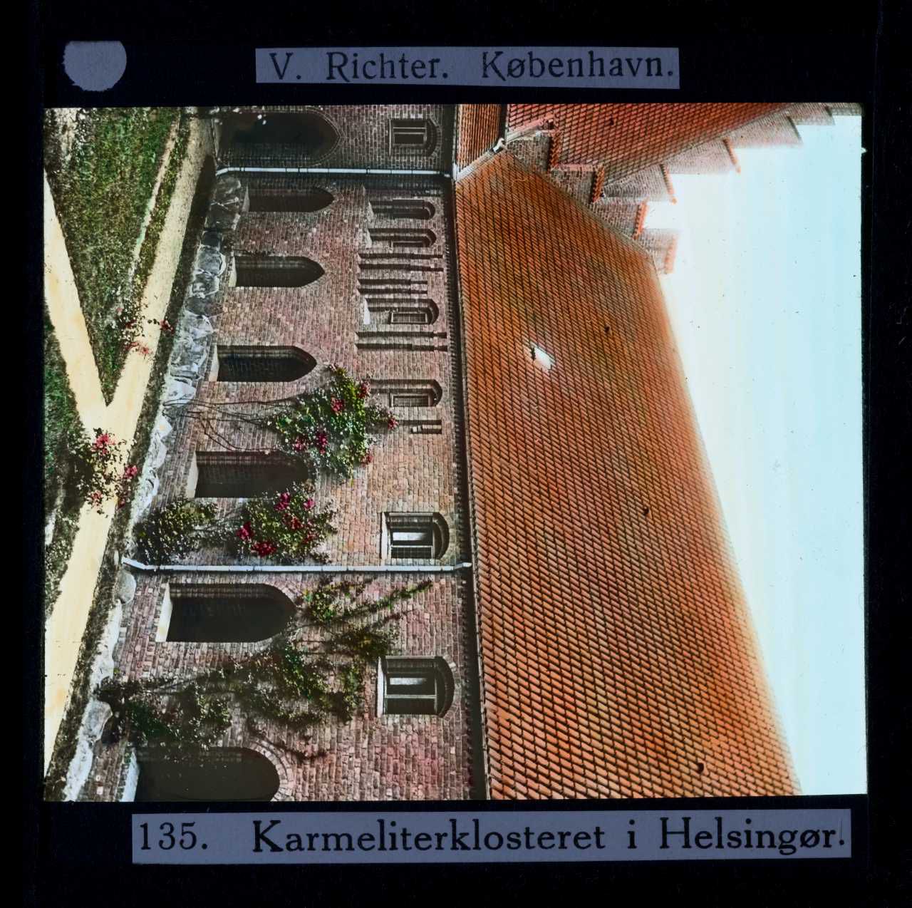 Billedet er håndkoloreret og stammer fra lysbilledserie nr. 2 benævnt "Øerne". På dias er påsat labels: "V. Richter. København." og "135. Karmeliterklosteret i Helsingør.". I serien er 49 lysbilleder. Firmaet V. Richter producerede, kuraterede og distribuerede lysbilledserier i primært 1920'erne og 1930'erne. Dias måler ca. 8 x 8 cm.