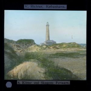 Titel hentet fra original dias. Billedet er håndkoloreret og stammer fra lysbilledserie nr. 5 benævnt "Jylland". På dias er påsat labels: "V. Richter. København." og "8. Klitter ved Skagens Fyrtaarn.". I serien er 48 lysbilleder. Firmaet V. Richter producerede, kuraterede og distribuerede lysbilledserier i primært 1920'erne og 1930'erne. Dias måler ca. 8 x 8 cm.