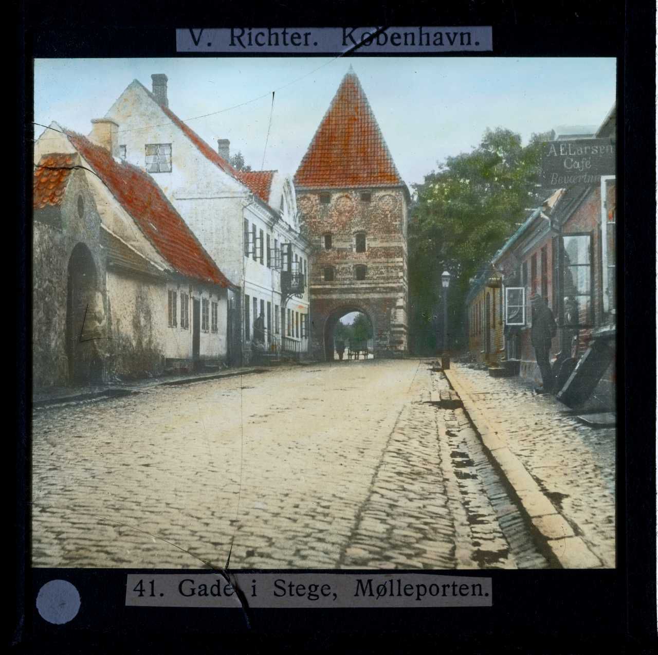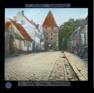 Billedet er håndkoloreret og stammer fra lysbilledserie nr. 2 benævnt "Øerne". På dias er påsat labels: "V. Richter. København." og "41. Gade i Stege, Mølleporten.". I serien er 49 lysbilleder. Firmaet V. Richter producerede, kuraterede og distribuerede lysbilledserier i primært 1920'erne og 1930'erne. Dias måler ca. 8 x 8 cm.