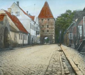 Billedet er håndkoloreret og stammer fra lysbilledserie nr. 2 benævnt "Øerne". På dias er påsat labels: "V. Richter. København." og "41. Gade i Stege, Mølleporten.". I serien er 49 lysbilleder. Firmaet V. Richter producerede, kuraterede og distribuerede lysbilledserier i primært 1920'erne og 1930'erne. Dias måler ca. 8 x 8 cm.