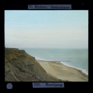 Titel hentet fra original dias. Billedet er håndkoloreret og stammer fra lysbilledserie nr. 5 benævnt "Jylland". På dias er påsat labels: "V. Richter. København." og "295. Bovbjerg.". I serien er 48 lysbilleder. Firmaet V. Richter producerede, kuraterede og distribuerede lysbilledserier i primært 1920'erne og 1930'erne. Dias måler ca. 8 x 8 cm.