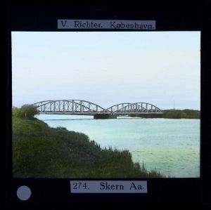 Billedet er håndkoloreret og stammer fra lysbilledserie nr. 5 benævnt "Jylland". På dias er påsat labels: "V. Richter. København." og "274. Skern Aa.". I serien er 48 lysbilleder. Firmaet V. Richter producerede, kuraterede og distribuerede lysbilledserier i primært 1920'erne og 1930'erne. Dias måler ca. 8 x 8 cm.