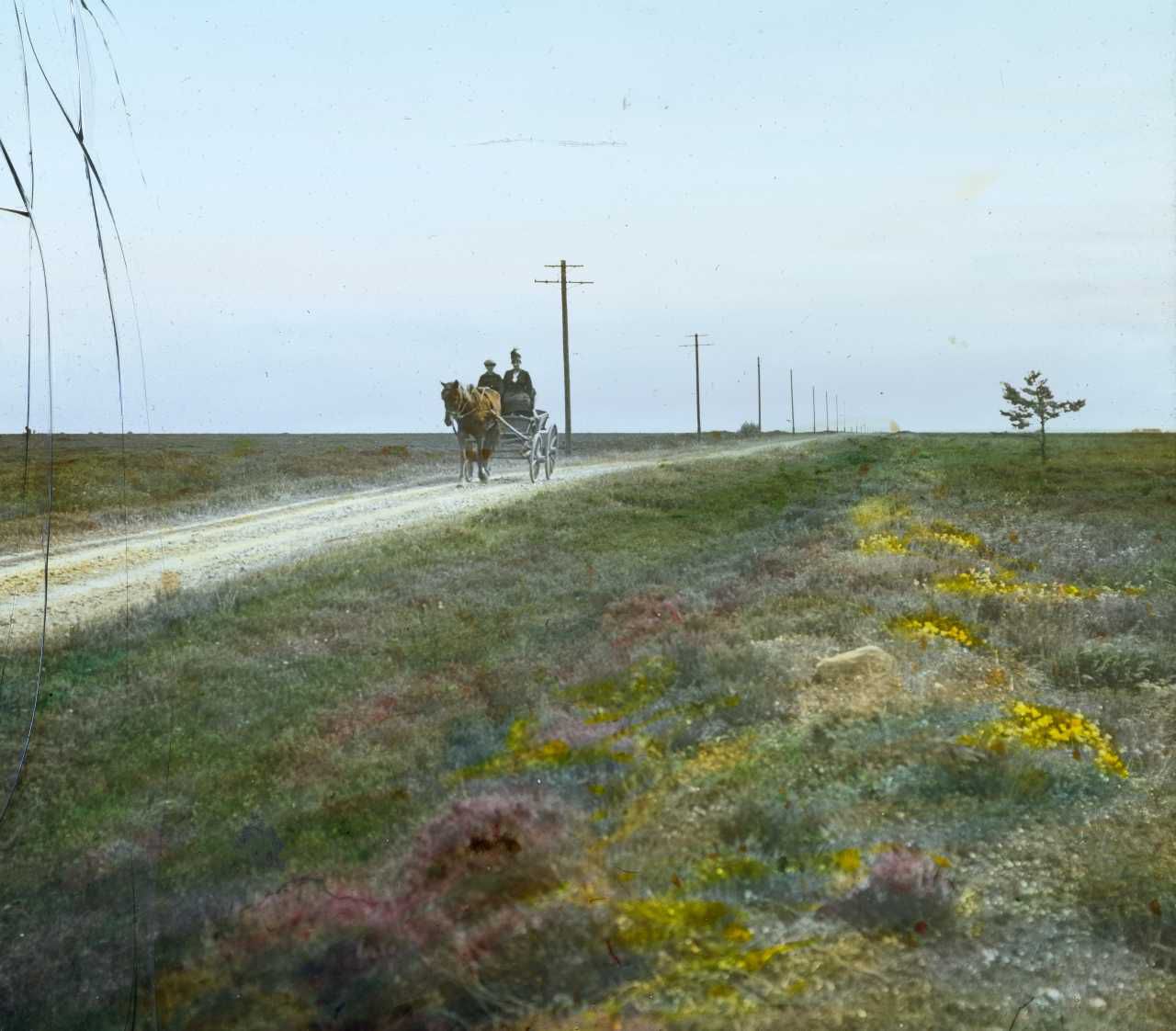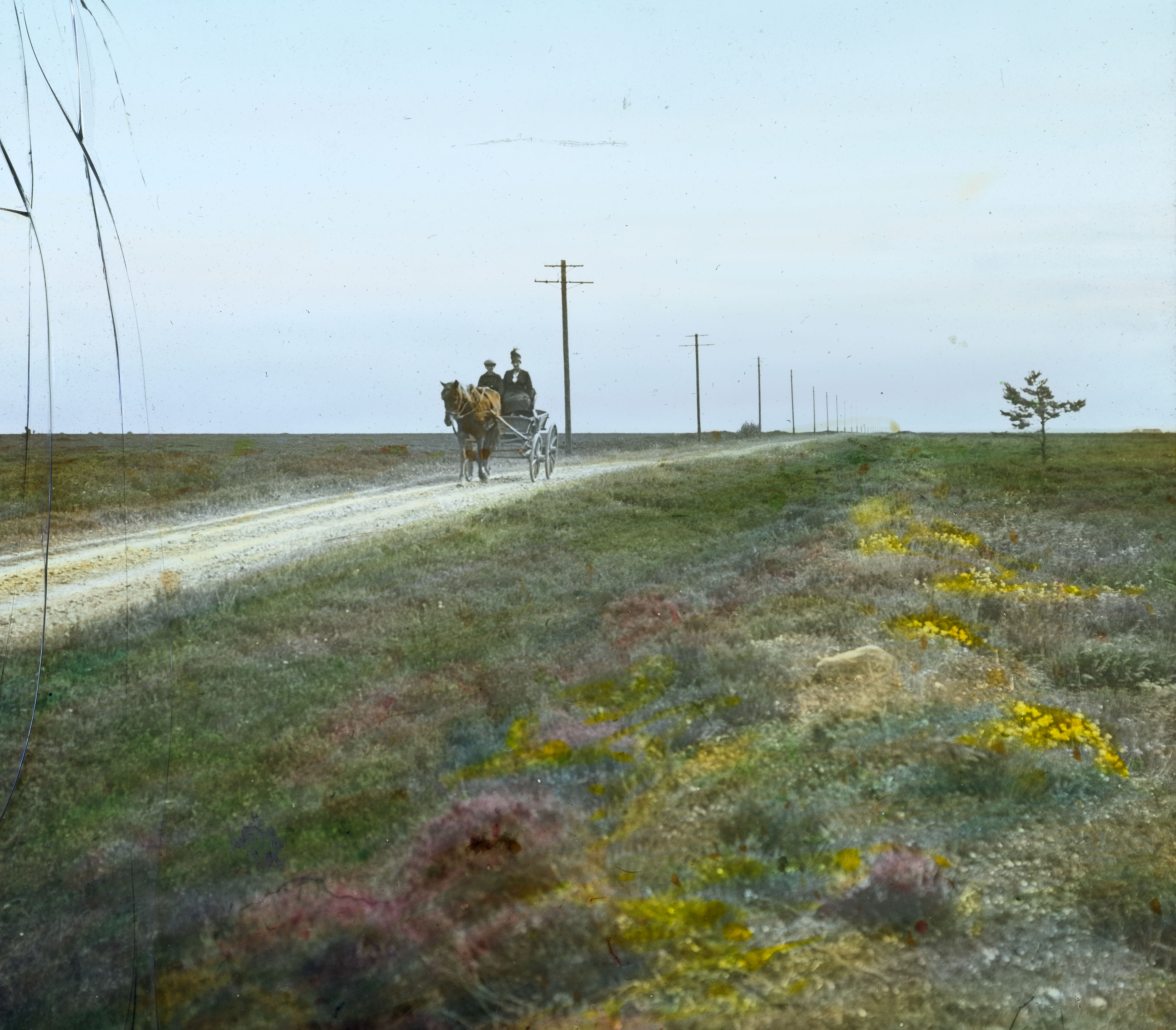 Titel hentet fra original dias. Billedet er håndkoloreret og stammer fra lysbilledserie nr. 12 benævnt "Midtjylland". På dias er påsat labels: "V. Richter. København." og "4. Vej over Alheden". I serien er 31 lysbilleder. Firmaet V. Richter producerede, kuraterede og distribuerede lysbilledserier i primært 1920'erne og 1930'erne. Dias måler ca. 8 x 8 cm.