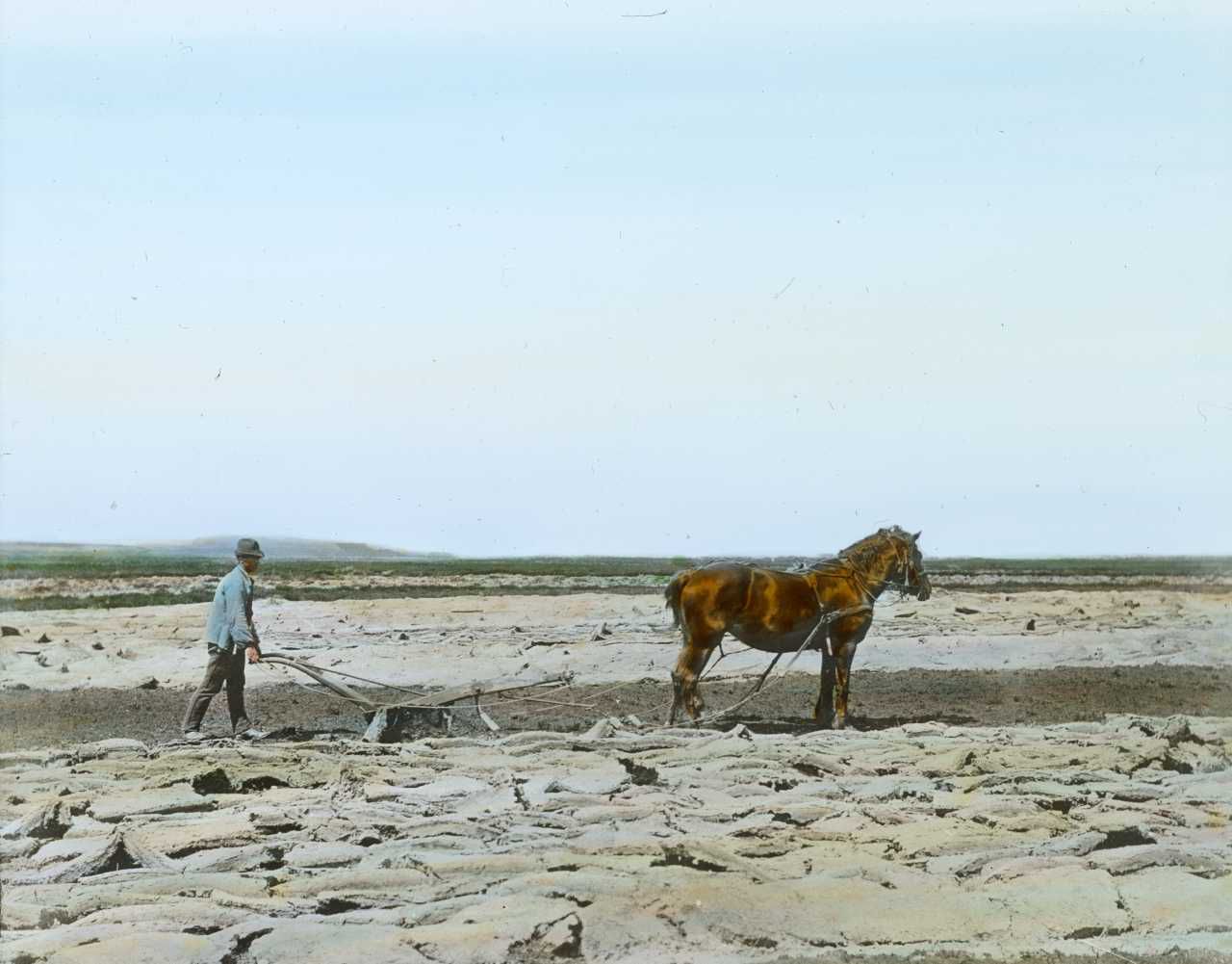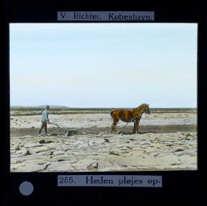 Titel hentet fra original dias. Billedet er håndkoloreret og stammer fra lysbilledserie nr. 5 benævnt "Jylland". På dias er påsat labels: "V. Richter. København." og "255. Heden pløjes op.". I serien er 48 lysbilleder. Firmaet V. Richter producerede, kuraterede og distribuerede lysbilledserier i primært 1920'erne og 1930'erne. Dias måler ca. 8 x 8 cm.