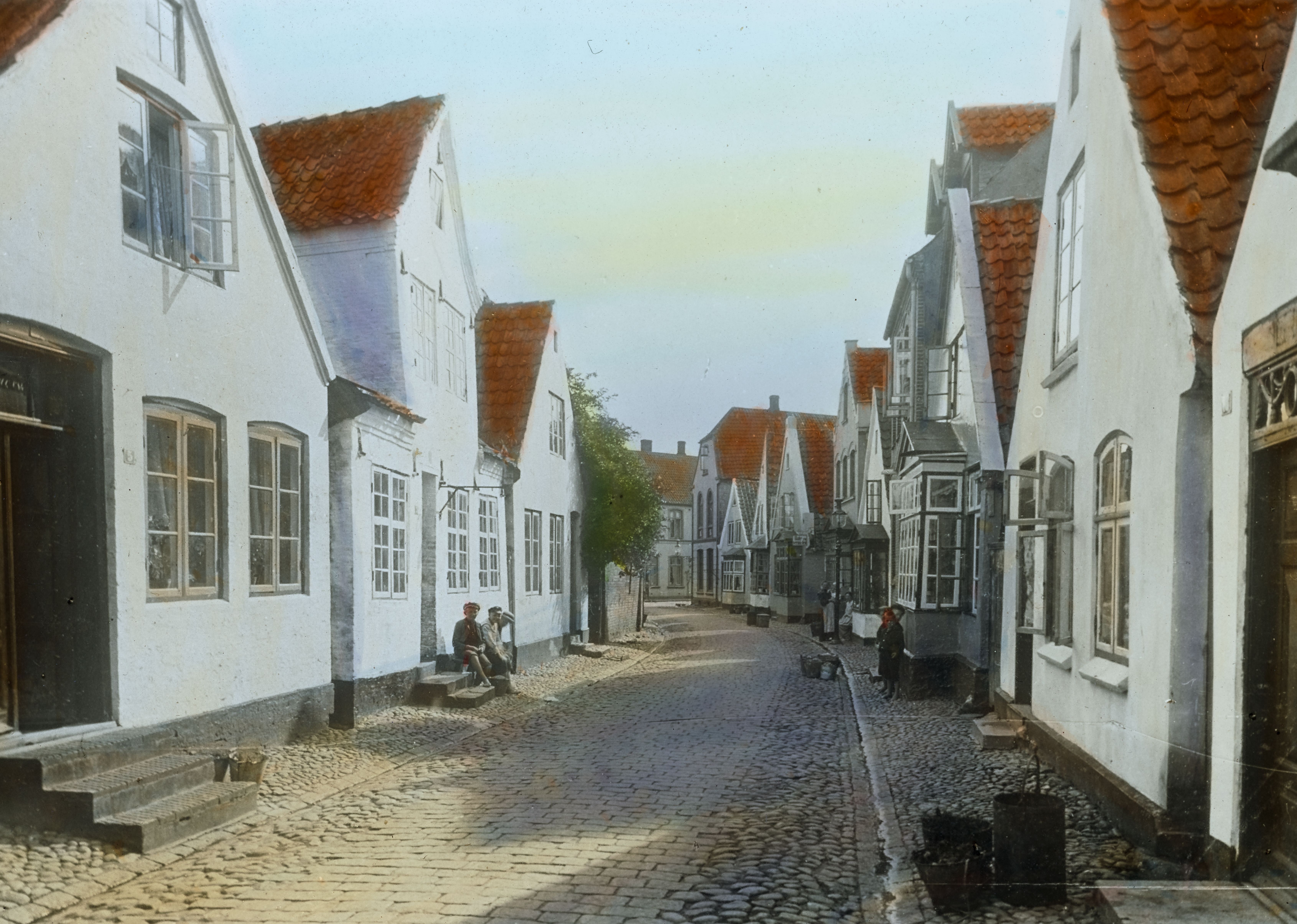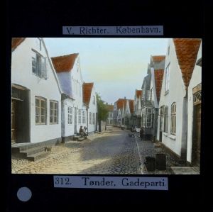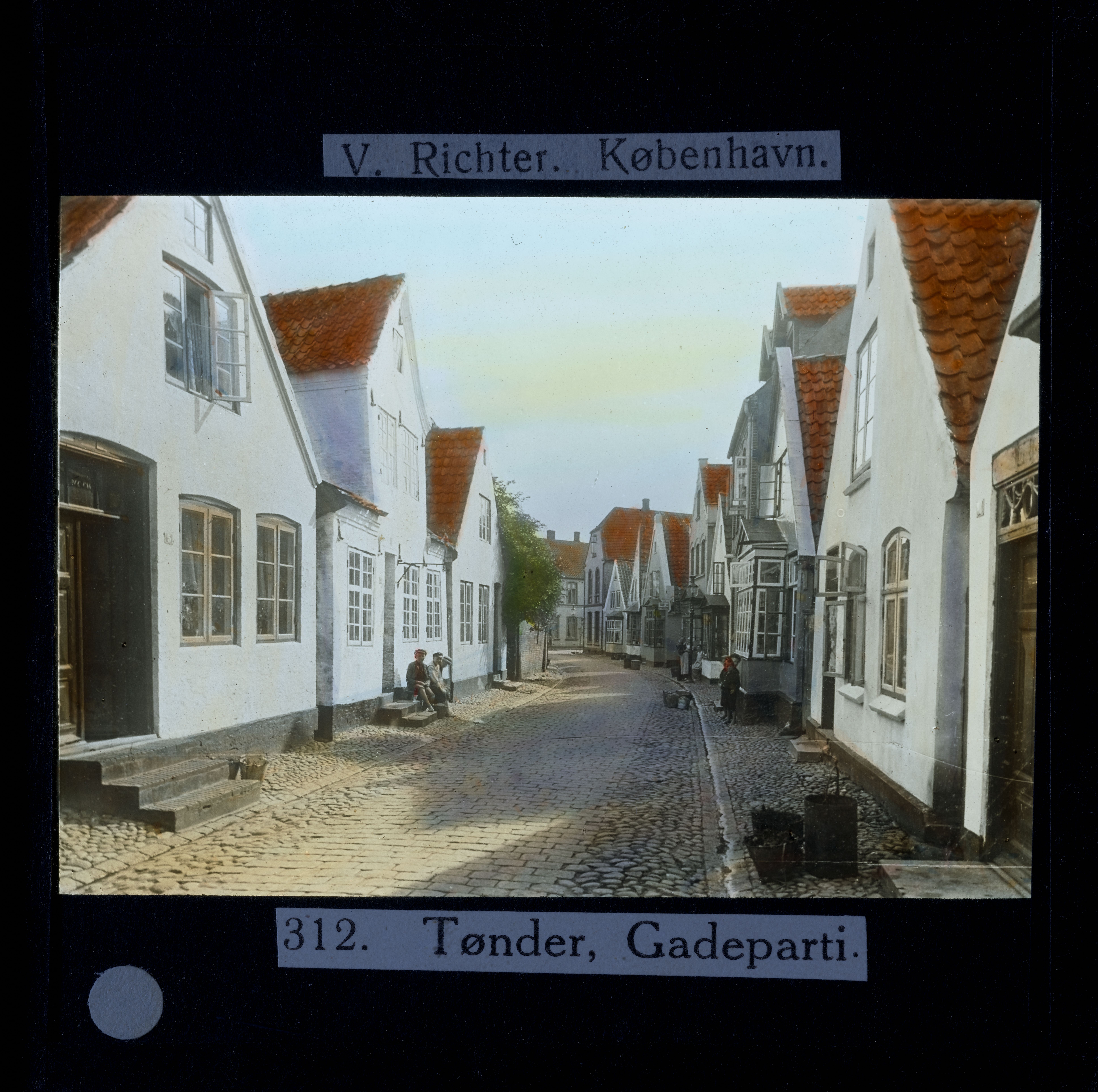 Billedet er håndkoloreret og stammer fra lysbilledserie nr. 5 benævnt "Jylland". På dias er påsat labels: "V. Richter. København." og "312. Tønder, Gadeparti.". I serien er 48 lysbilleder. Firmaet V. Richter producerede, kuraterede og distribuerede lysbilledserier i primært 1920'erne og 1930'erne. Dias måler ca. 8 x 8 cm.