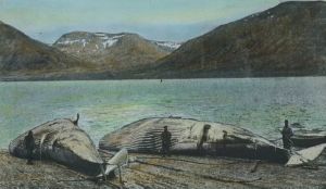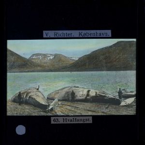 Titel hentet fra original dias. Billedet er håndkoloreret og stammer fra lysbilledserie nr. 56 benævnt "Grønland". På dias er påsat labels: "V. Richter. København." og "63. Hvalfangst.". I serien er 47 lysbilleder. Firmaet V. Richter producerede, kuraterede og distribuerede lysbilledserier i primært 1920'erne og 1930'erne. Dias måler ca. 8 x 8 cm.