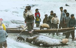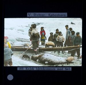 Titel hentet fra original dias. Billedet er håndkoloreret og stammer fra lysbilledserie nr. 56 benævnt "Grønland". På dias er påsat labels: "V. Richter. København." og "469. Kajak hjemkommen med Sæl.". I serien er 47 lysbilleder. Firmaet V. Richter producerede, kuraterede og distribuerede lysbilledserier i primært 1920'erne og 1930'erne. Dias måler ca. 8 x 8 cm.