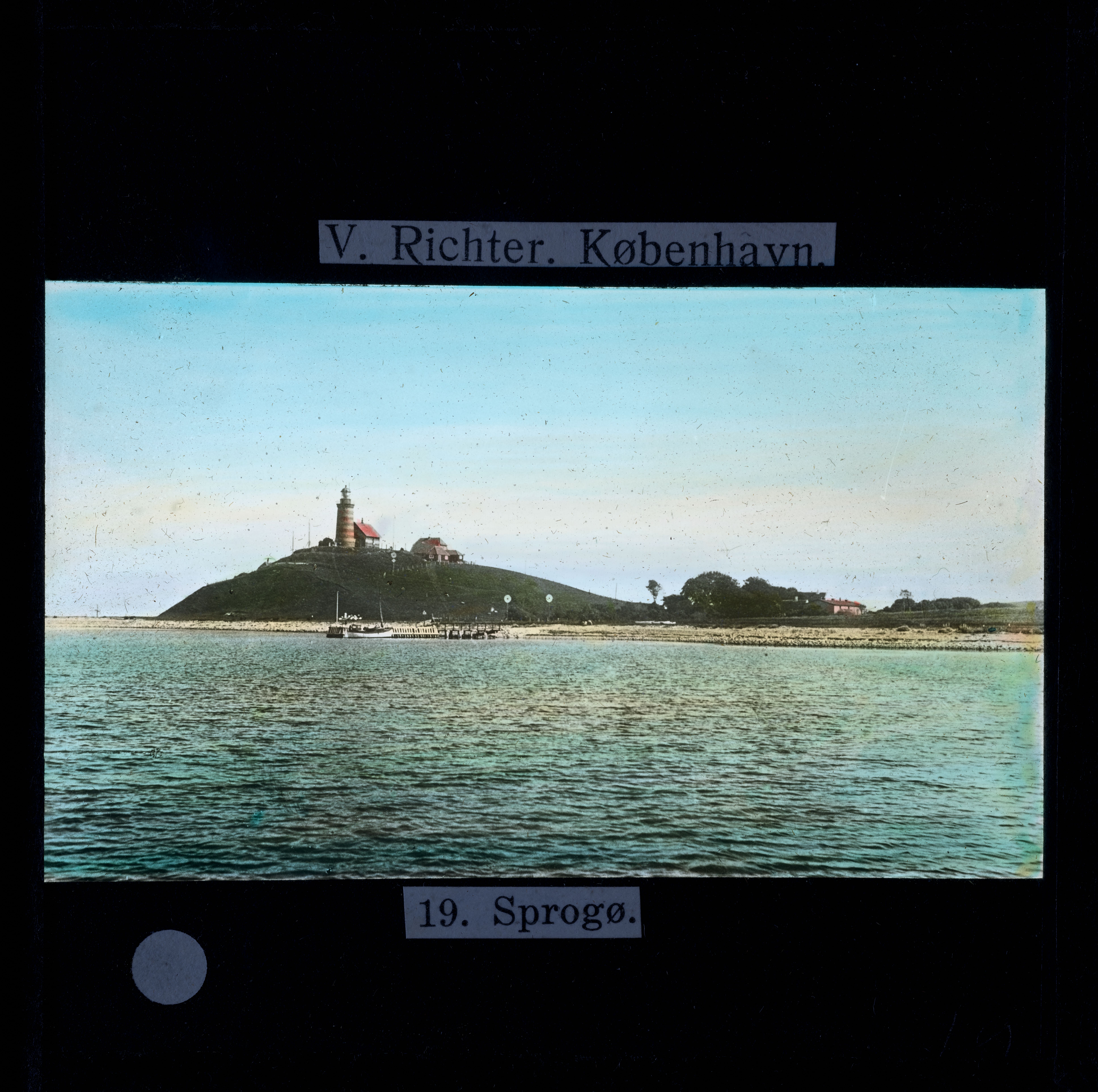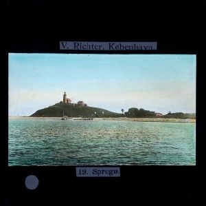 Titel hentet fra original dias. Billedet er håndkoloreret og stammer fra lysbilledserie nr. 115 benævnt "Vestsjælland". På dias er påsat labels: "V. Richter. København." og "19. Sprogø.". I serien er 38 lysbilleder. Firmaet V. Richter producerede, kuraterede og distribuerede lysbilledserier i primært 1920'erne og 1930'erne. Dias måler ca. 8 x 8 cm.