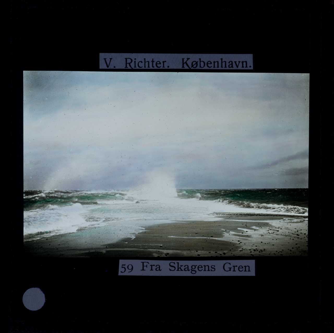 Billedet er håndkoloreret og stammer fra lysbilledserie nr. 117 benævnt "Danmark". På dias er påsat labels: "V. Richter. København." og "59 Fra Skagens Gren". I serien er 213 lysbilleder. Firmaet V. Richter producerede, kuraterede og distribuerede lysbilledserier i primært 1920'erne og 1930'erne. Dias måler ca. 8 x 8 cm.