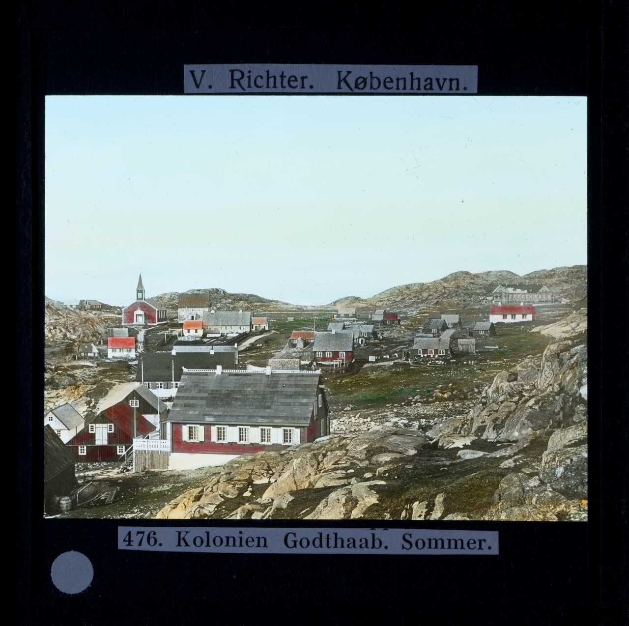 Billedet er håndkoloreret og stammer fra lysbilledserie nr. 56 benævnt "Grønland". På dias er påsat labels: "V. Richter. København." og "476. Kolonien Godthaab. Sommer.". I serien er 47 lysbilleder. Firmaet V. Richter producerede, kuraterede og distribuerede lysbilledserier i primært 1920'erne og 1930'erne. Dias måler ca. 8 x 8 cm.