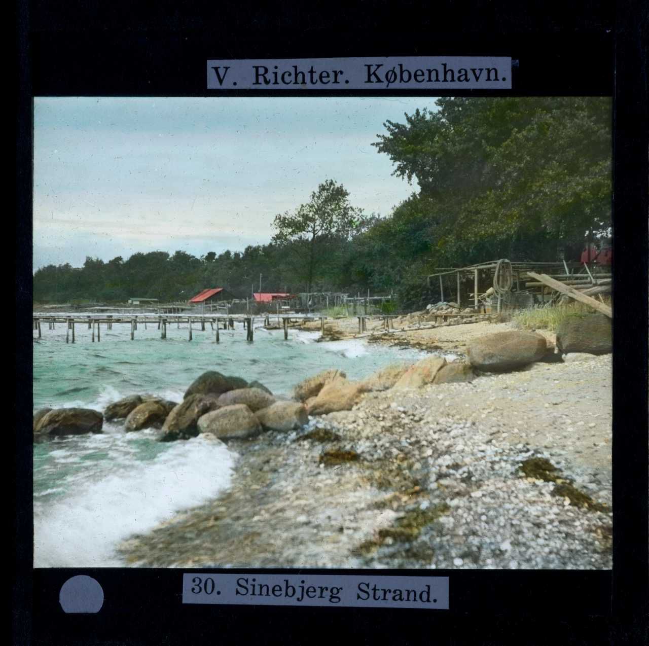 Titel hentet fra original dias. Billedet er håndkoloreret og stammer fra lysbilledserie nr. 119 benævnt "Fyn". På dias er påsat labels: "V. Richter. København." og "30. Sinebjerg Strand.". I serien er 51 lysbilleder. Firmaet V. Richter producerede, kuraterede og distribuerede lysbilledserier i primært 1920'erne og 1930'erne. Dias måler ca. 8 x 8 cm.