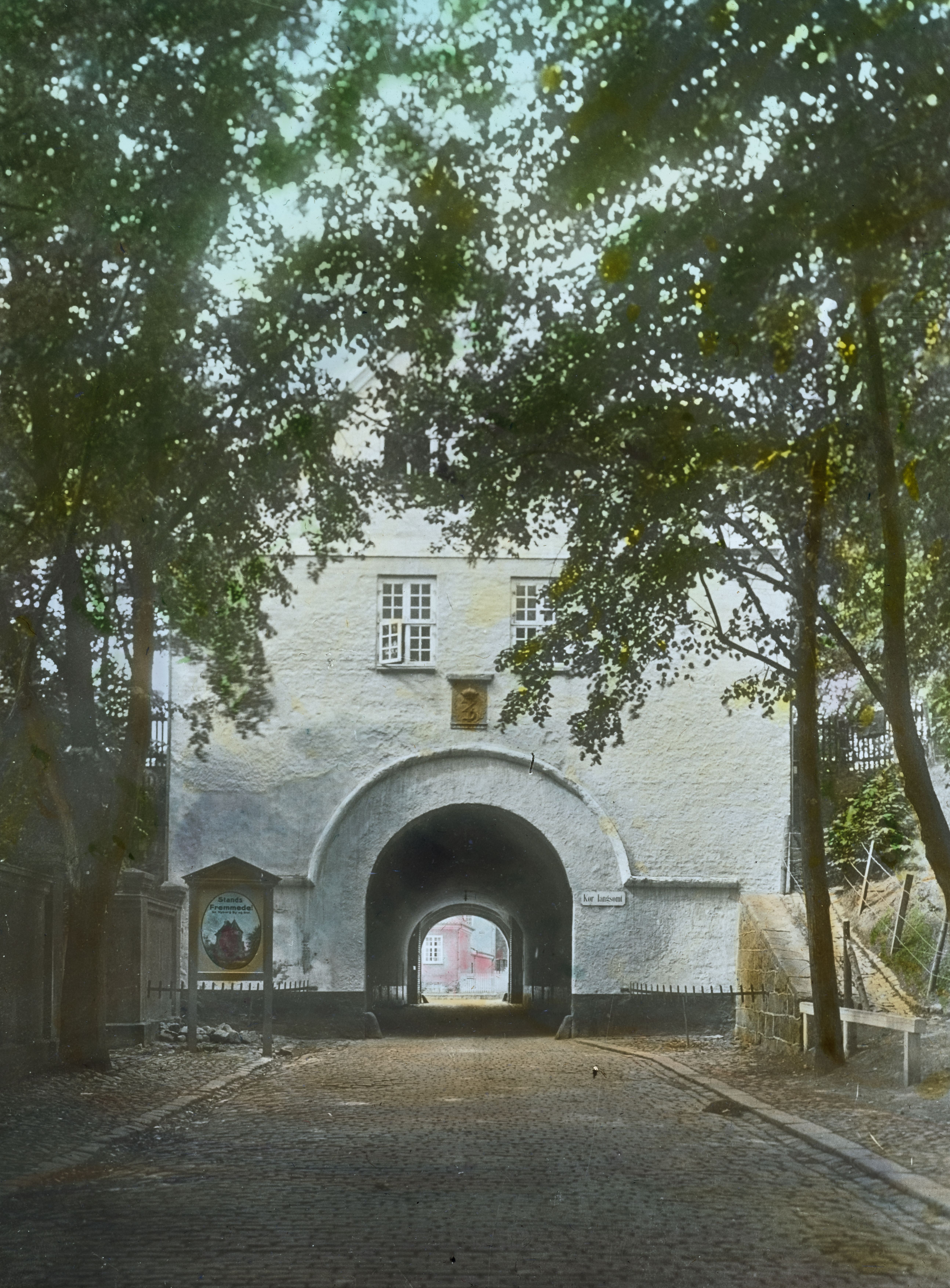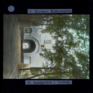 Titel hentet fra original dias. Billedet er håndkoloreret og stammer fra lysbilledserie nr. 119 benævnt "Fyn". På dias er påsat labels: "V. Richter. København." og "38. Landporten i Nyborg.". I serien er 51 lysbilleder. Firmaet V. Richter producerede, kuraterede og distribuerede lysbilledserier i primært 1920'erne og 1930'erne. Dias måler ca. 8 x 8 cm.