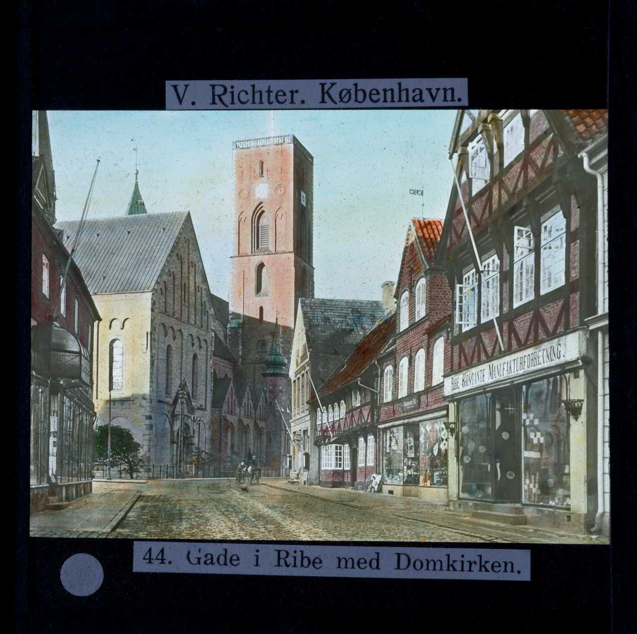Billedet er håndkoloreret og stammer fra lysbilledserie nr. 115 benævnt "Vestsjælland". På dias er påsat labels: "V. Richter. København." og "44. Gade i Ribe med Domkirken.". I serien er 38 lysbilleder. Firmaet V. Richter producerede, kuraterede og distribuerede lysbilledserier i primært 1920'erne og 1930'erne. Dias måler ca. 8 x 8 cm.