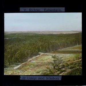 Titel hentet fra original dias. Billedet er håndkoloreret og stammer fra lysbilledserie nr. 117 benævnt "Danmark". På dias er påsat labels: "V. Richter. København." og "22 Udsigt mod Silkeborg". I serien er 213 lysbilleder. Firmaet V. Richter producerede, kuraterede og distribuerede lysbilledserier i primært 1920'erne og 1930'erne. Dias måler ca. 8 x 8 cm.