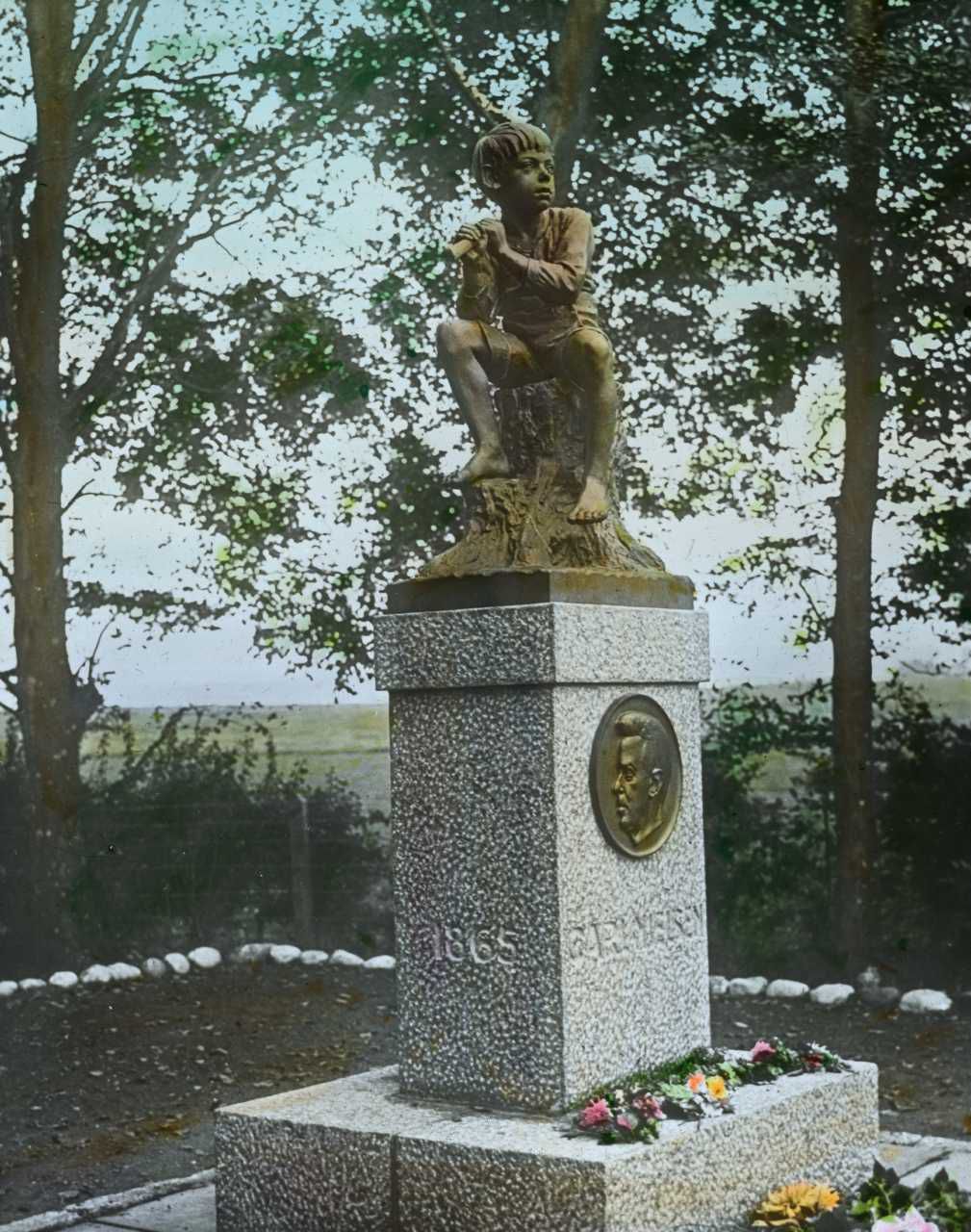 Billedet er håndkoloreret og stammer fra lysbilledserie nr. 119 benævnt "Fyn". På dias er påsat labels: "V. Richter. København." og "54. Carl Nielsens Monument.". I serien er 51 lysbilleder. Firmaet V. Richter producerede, kuraterede og distribuerede lysbilledserier i primært 1920'erne og 1930'erne. Dias måler ca. 8 x 8 cm.