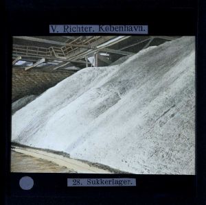Titel hentet fra original dias. Billedet er håndkoloreret og stammer fra lysbilledserie nr. 220 benævnt "Lolland-Falster". På dias er påsat labels: "V. Richter. København." og "28. Sukkerlager.". I serien er 52 lysbilleder. Firmaet V. Richter producerede, kuraterede og distribuerede lysbilledserier i primært 1920'erne og 1930'erne. Dias måler ca. 8 x 8 cm.
