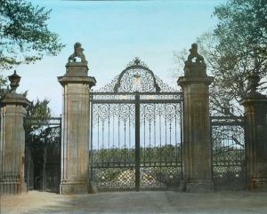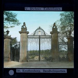 Billedet er håndkoloreret og stammer fra lysbilledserie nr. 220 benævnt "Lolland-Falster". På dias er påsat labels: "V. Richter. København." og "30. Knuthenborg, Bandholmporten.". I serien er 52 lysbilleder. Firmaet V. Richter producerede, kuraterede og distribuerede lysbilledserier i primært 1920'erne og 1930'erne. Dias måler ca. 8 x 8 cm.