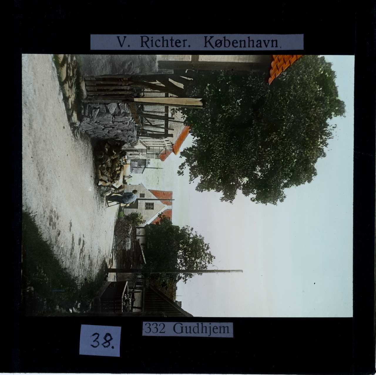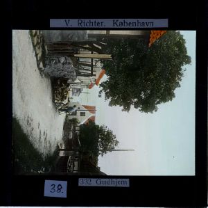 Titel hentet fra original dias. Billedet er håndkoloreret og stammer fra lysbilledserie nr. 117 benævnt "Danmark". På dias er påsat labels: "V. Richter. København.", "332 Gudhjem" og "38.". I serien er 213 lysbilleder. Firmaet V. Richter producerede, kuraterede og distribuerede lysbilledserier i primært 1920'erne og 1930'erne. Dias måler ca. 8 x 8 cm.