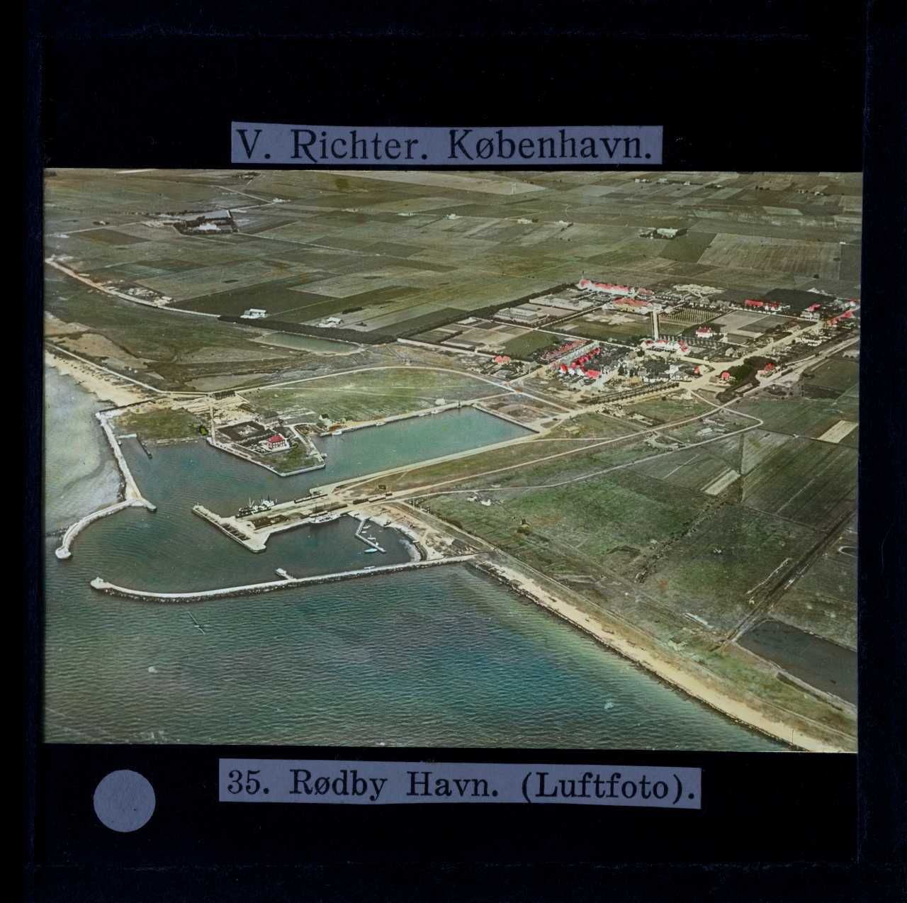 Billedet er håndkoloreret og stammer fra lysbilledserie nr. 220 benævnt "Lolland-Falster". På dias er påsat labels: "V. Richter. København." og "35. Rødby Havn. (Luftfoto).". I serien er 52 lysbilleder. Firmaet V. Richter producerede, kuraterede og distribuerede lysbilledserier i primært 1920'erne og 1930'erne. Dias måler ca. 8 x 8 cm.