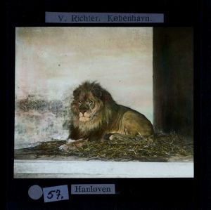 Billedet er håndkoloreret og stammer fra lysbilledserie nr. 117 benævnt "Danmark". På dias er påsat labels: "V. Richter. København." og "57. Hanløven". I serien er 213 lysbilleder. Firmaet V. Richter producerede, kuraterede og distribuerede lysbilledserier i primært 1920'erne og 1930'erne. Dias måler ca. 8 x 8 cm.
