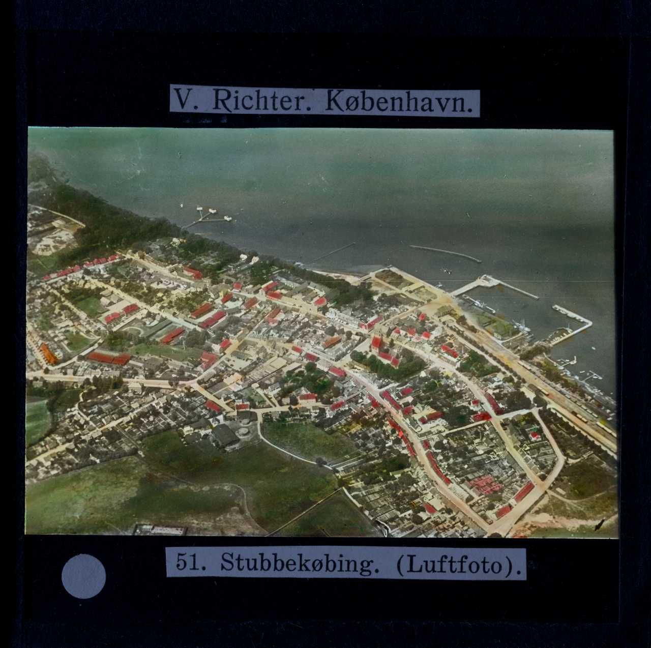 Titel hentet fra original dias. Billedet er håndkoloreret og stammer fra lysbilledserie nr. 220 benævnt "Lolland-Falster". På dias er påsat labels: "V. Richter. København." og "51. Stubbekøbing. (Luftfoto).". I serien er 52 lysbilleder. Firmaet V. Richter producerede, kuraterede og distribuerede lysbilledserier i primært 1920'erne og 1930'erne. Dias måler ca. 8 x 8 cm.