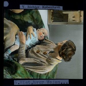 Billedet er håndkoloreret og stammer fra lysbilledserie nr. 117 benævnt "Danmark". På dias er påsat labels: "V. Richter. København." og "6. Hist, hvor Vejen...". I serien er 213 lysbilleder. Firmaet V. Richter producerede, kuraterede og distribuerede lysbilledserier i primært 1920'erne og 1930'erne. Dias måler ca. 8 x 8 cm.