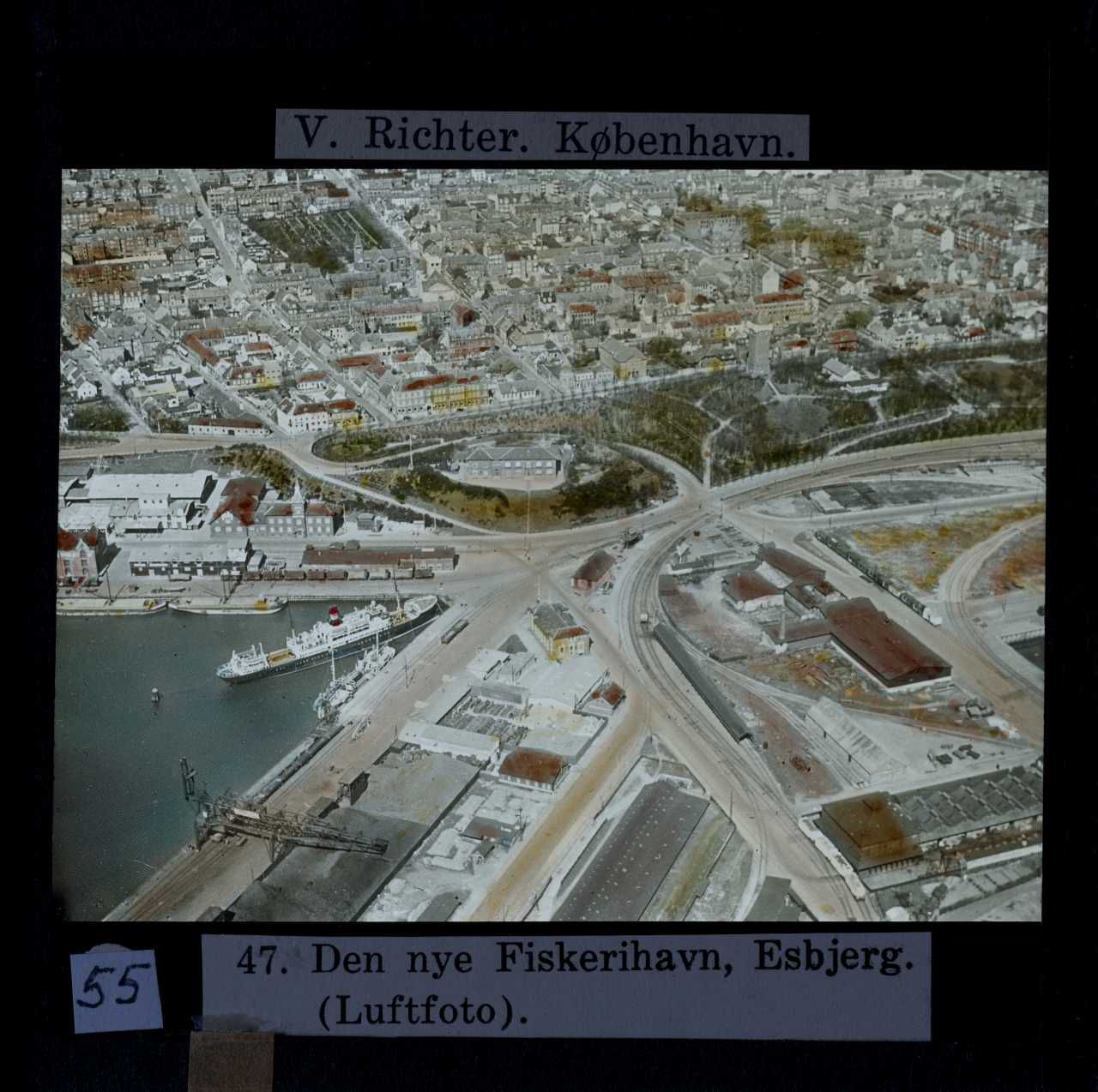 Billedet er håndkoloreret og stammer fra lysbilledserie nr. 117 benævnt "Danmark". På dias er påsat labels: "V. Richter. København.", "55" og "47. Den nye Fiskerihavn, Esbjerg. (Luftfoto).". I serien er 213 lysbilleder. Firmaet V. Richter producerede, kuraterede og distribuerede lysbilledserier i primært 1920'erne og 1930'erne. Dias måler ca. 8 x 8 cm.