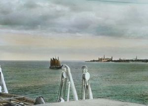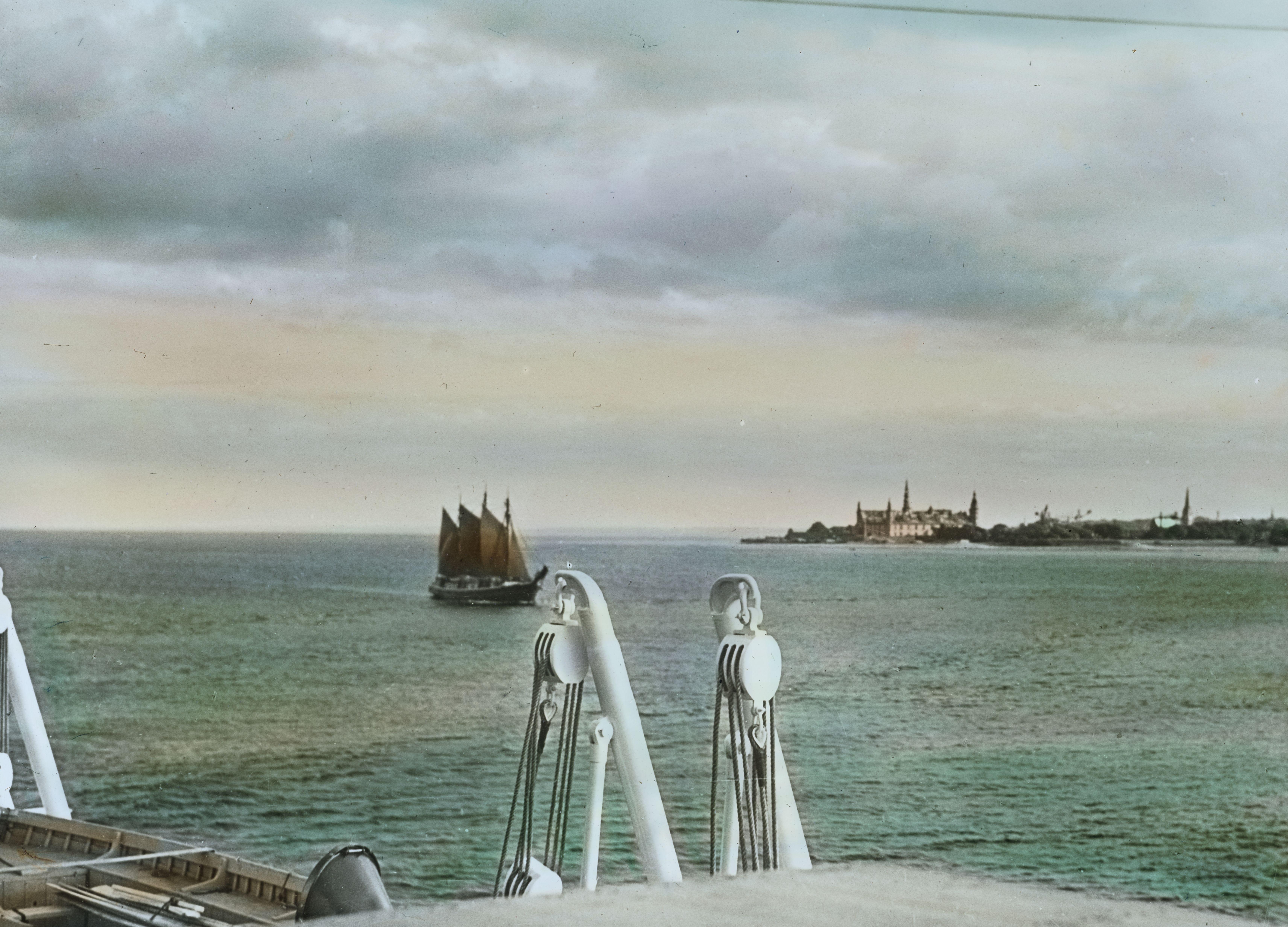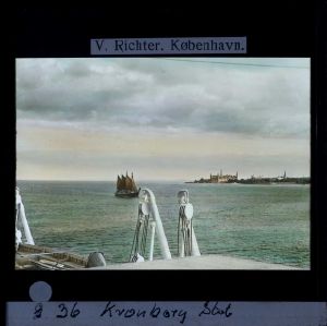 Titel hentet fra original dias. Billedet er håndkoloreret og stammer fra lysbilledserie nr. 117 benævnt "Danmark". På dias er påsat labels: "V. Richter. København." og "36 Kronborg Slot". I serien er 213 lysbilleder. Firmaet V. Richter producerede, kuraterede og distribuerede lysbilledserier i primært 1920'erne og 1930'erne. Dias måler ca. 8 x 8 cm.