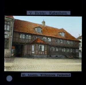 Billedet er håndkoloreret og stammer fra lysbilledserie nr. 117 benævnt "Danmark". På dias er påsat labels: "V. Richter. København." og "40. Assens. Willemoes Fødested". I serien er 213 lysbilleder. Firmaet V. Richter producerede, kuraterede og distribuerede lysbilledserier i primært 1920'erne og 1930'erne. Dias måler ca. 8 x 8 cm.