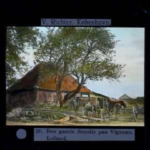 Billedet er håndkoloreret og stammer fra lysbilledserie nr. 117 benævnt "Danmark". På dias er påsat labels: "V. Richter. København." og "20. Den gamle Smedie på Vigsnæs. Lolland.". I serien er 213 lysbilleder. Firmaet V. Richter producerede, kuraterede og distribuerede lysbilledserier i primært 1920'erne og 1930'erne. Dias måler ca. 8 x 8 cm.