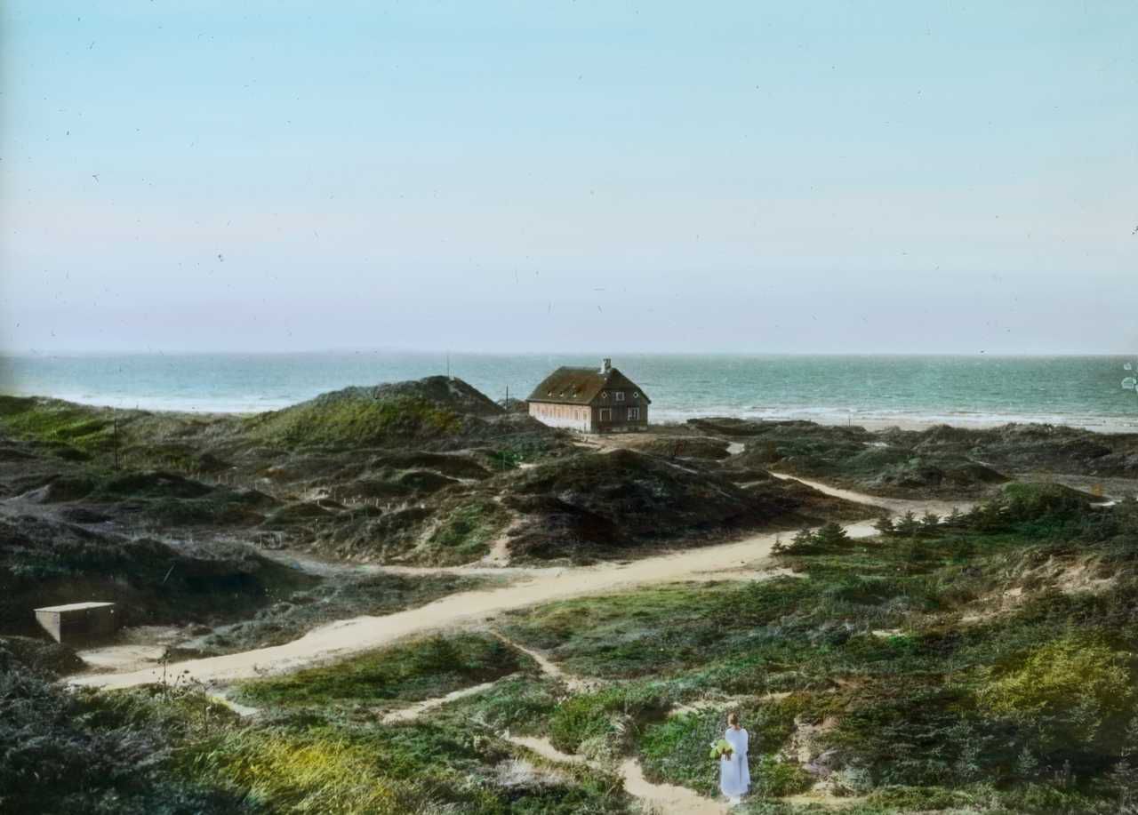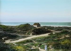Titel hentet fra original dias. Billedet er håndkoloreret og stammer fra lysbilledserie nr. 117 benævnt "Danmark". På dias er påsat labels: "V. Richter. København." og "Ved Slettestrand.". I serien er 213 lysbilleder. Firmaet V. Richter producerede, kuraterede og distribuerede lysbilledserier i primært 1920'erne og 1930'erne. Dias måler ca. 8 x 8 cm.