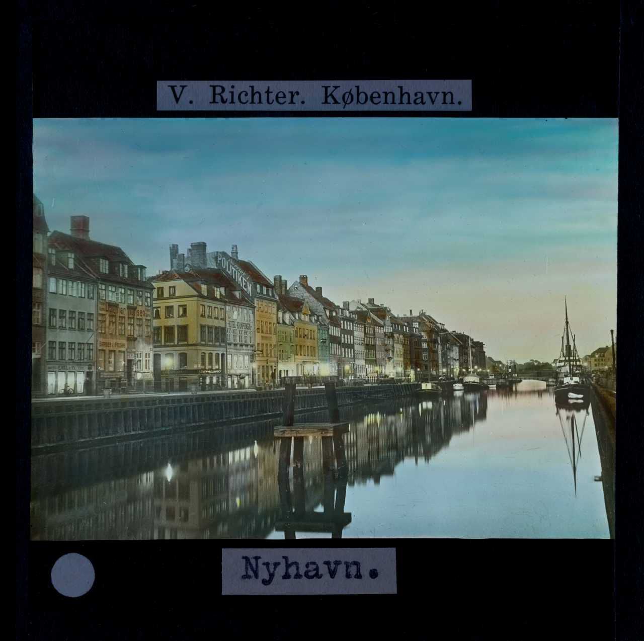 Titel hentet fra original dias. Billedet er håndkoloreret og stammer fra lysbilledserie nr. 117 benævnt "Danmark". På dias er påsat labels: "V. Richter. København." og "Nyhavn.". I serien er 213 lysbilleder. Firmaet V. Richter producerede, kuraterede og distribuerede lysbilledserier i primært 1920'erne og 1930'erne. Dias måler ca. 8 x 8 cm.
