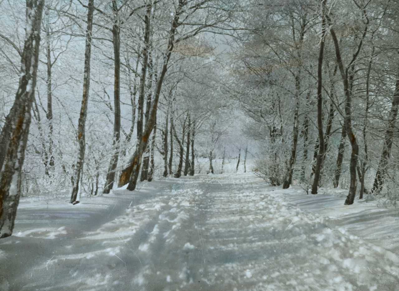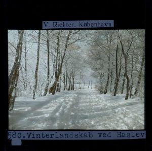 Titel hentet fra original dias. Billedet er håndkoloreret og stammer fra lysbilledserie nr. 117 benævnt "Danmark". På dias er påsat labels: "V. Richter. København." og "580. Vinterlandskab ved Haslev". I serien er 213 lysbilleder. Firmaet V. Richter producerede, kuraterede og distribuerede lysbilledserier i primært 1920'erne og 1930'erne. Dias måler ca. 8 x 8 cm.