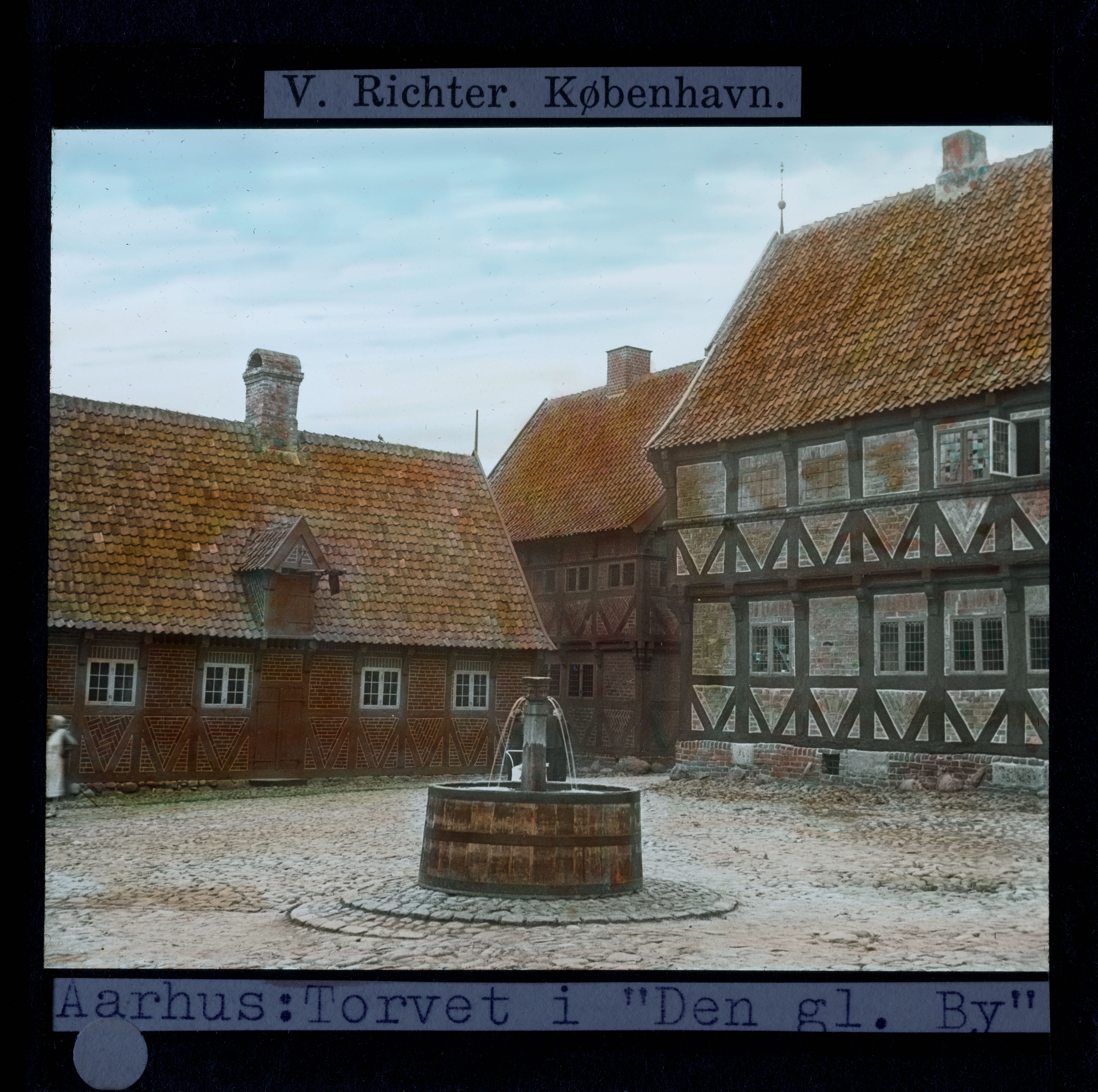 Billedet er håndkoloreret og stammer fra lysbilledserie nr. 117 benævnt "Danmark". På dias er påsat labels: "V. Richter. København." og "Aarhus: Torvet i "Den gl. By"". I serien er 213 lysbilleder. Firmaet V. Richter producerede, kuraterede og distribuerede lysbilledserier i primært 1920'erne og 1930'erne. Dias måler ca. 8 x 8 cm.