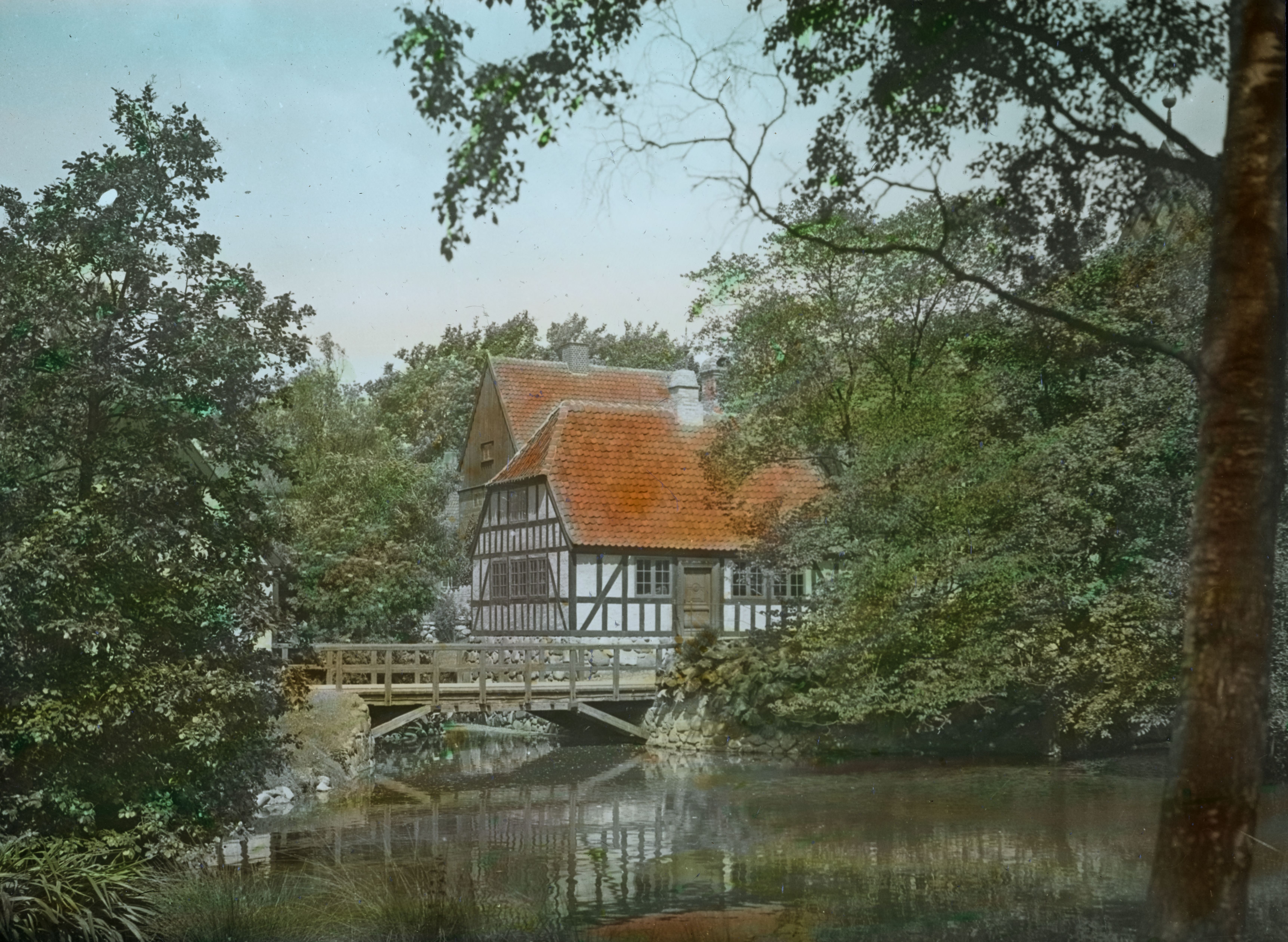 Billedet er håndkoloreret og stammer fra lysbilledserie nr. 117 benævnt "Danmark". På dias er påsat labels: "V. Richter. København." og "Aarhus, "Den gamle By".". I serien er 213 lysbilleder. Firmaet V. Richter producerede, kuraterede og distribuerede lysbilledserier i primært 1920'erne og 1930'erne. Dias måler ca. 8 x 8 cm.