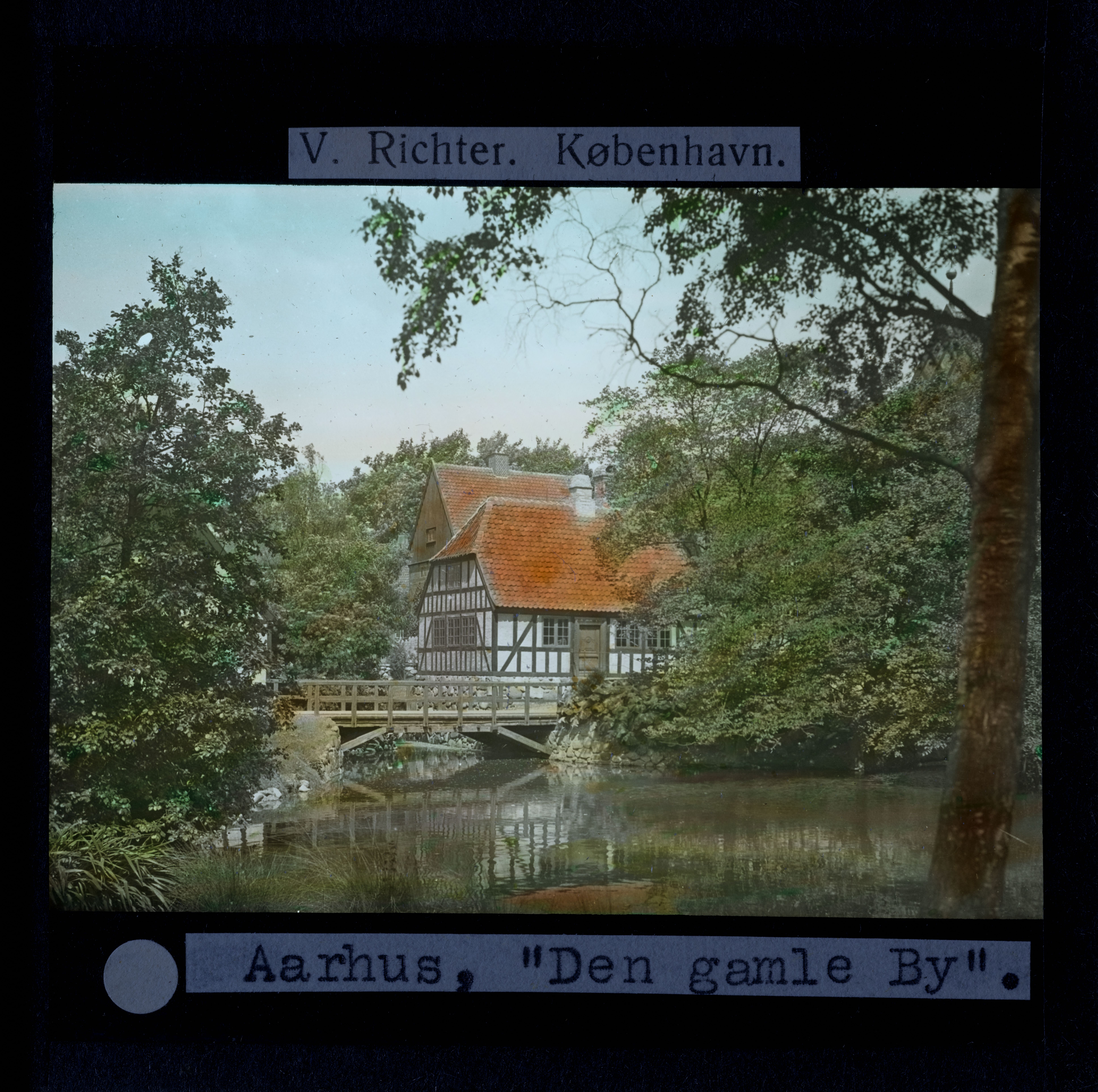 Billedet er håndkoloreret og stammer fra lysbilledserie nr. 117 benævnt "Danmark". På dias er påsat labels: "V. Richter. København." og "Aarhus, "Den gamle By".". I serien er 213 lysbilleder. Firmaet V. Richter producerede, kuraterede og distribuerede lysbilledserier i primært 1920'erne og 1930'erne. Dias måler ca. 8 x 8 cm.