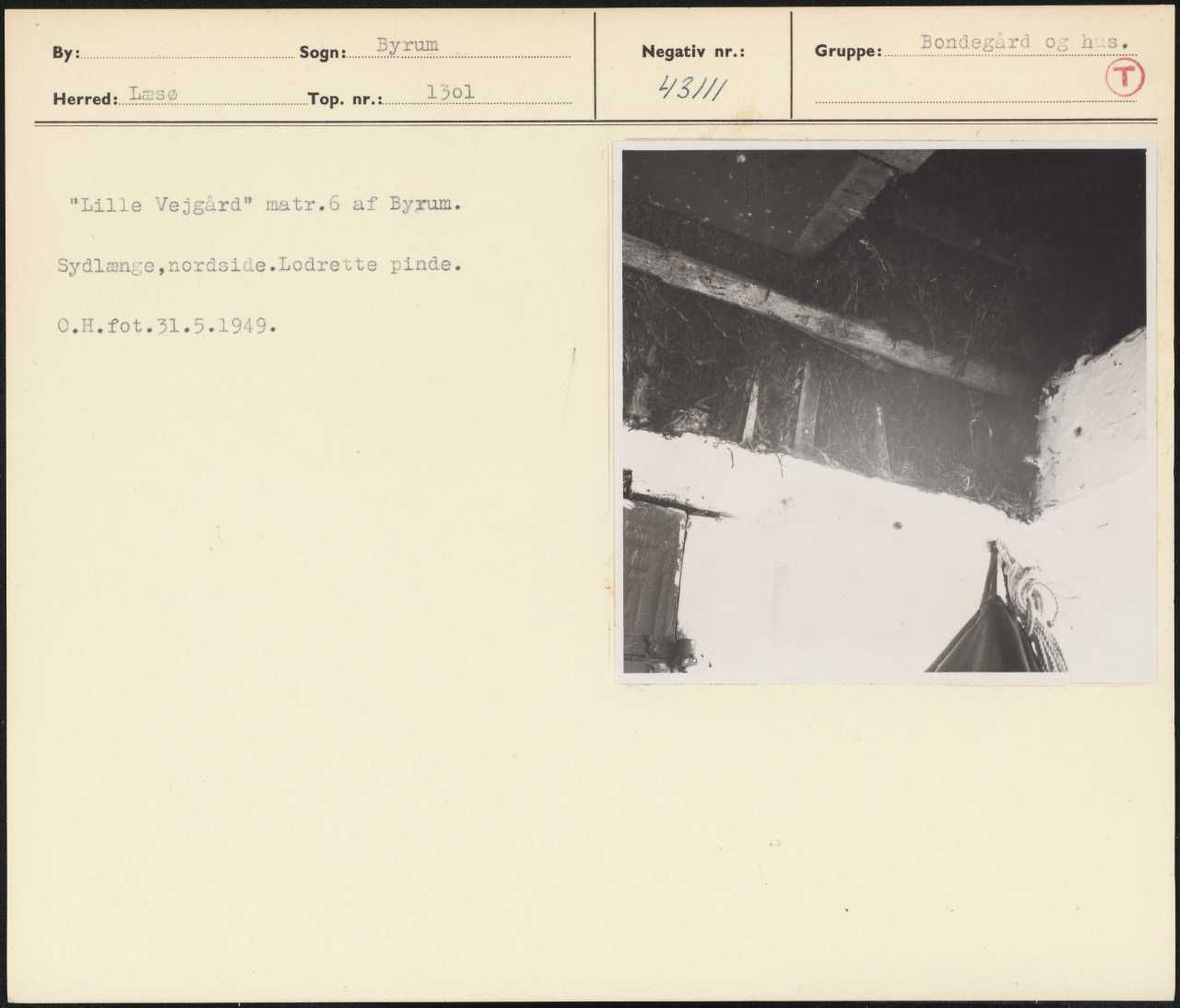 Maskingenkendt tekst fra arkivkort. Lille Vejgård" matr.6 af Byrum. Sydlænsge,nordside.Lodrette pinde. 0.H.fot .31.5.1949.