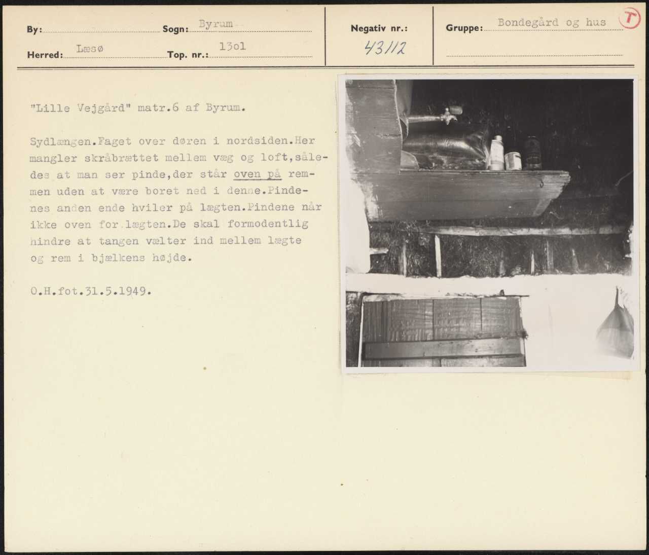 Maskingenkendt tekst fra arkivkort. Lille Vejgård" matr.6 af Byrum. Sydlænzgen.Faget over døren i nordsiden.Her mangler skråbrættet mellem væg og loft,såle- des at man ser pinde,der står oven på rem: men uden at være boret ned i dense.rinde- i » : i nes anden ende hviler på lægten.Pindene nur ikke oven for. lægten.De skal formodentlig nindre at tangen vælter ind mellem lægte og rem i bjælkens højde; 0.H.fot.31.5.1949. å : L f y !