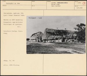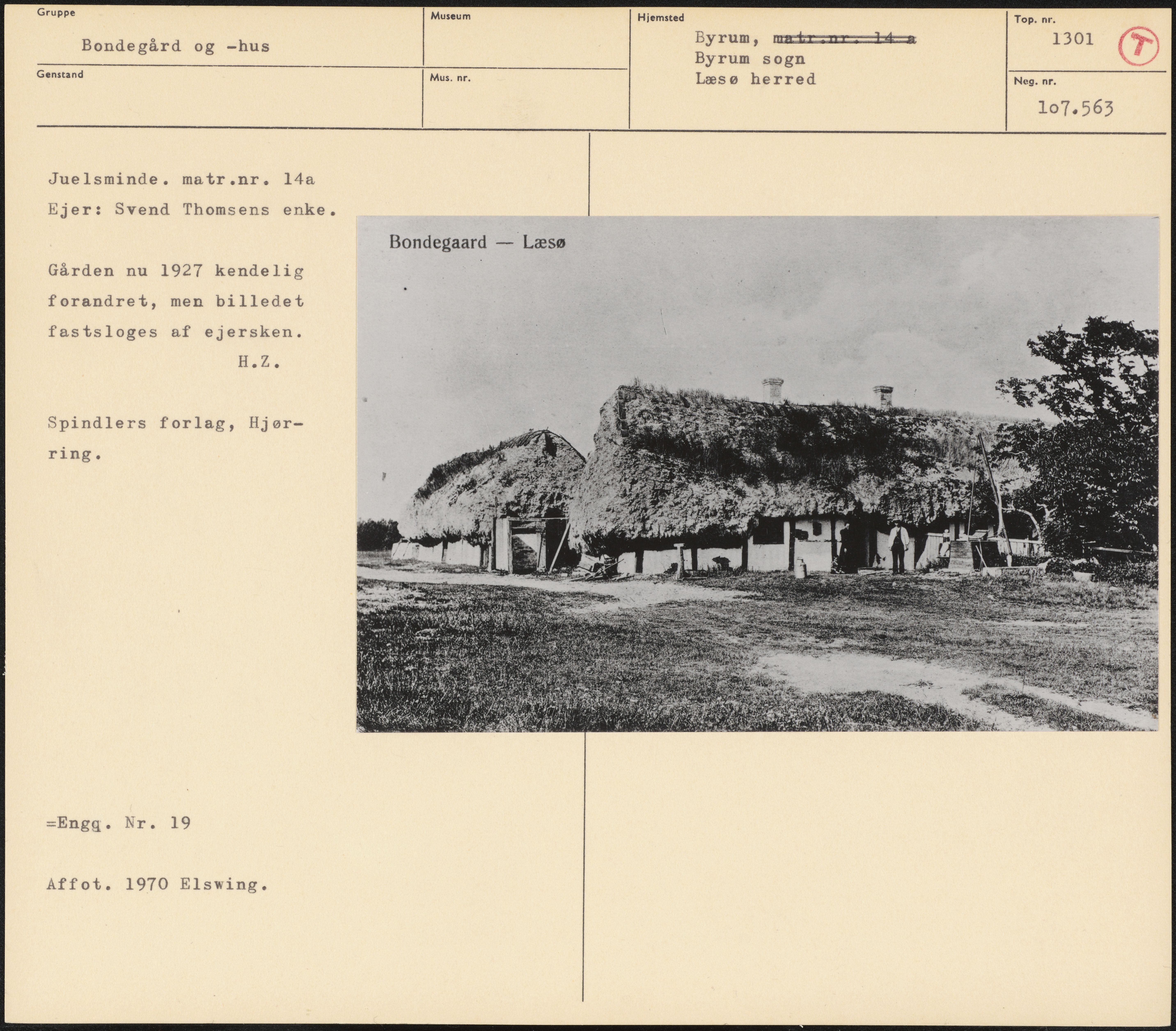 Maskingenkendt tekst fra arkivkort. Juelsminde. matr.nr. l4a Ejer: Svend Thomsens enke. Gården nu 1927 kendelig forandret, men billedet fastsloges af ejersken. H.7. Spindlers forlag, Hjør- ring. =Engq. Nr. 19 Affot. 1970 Elswing.