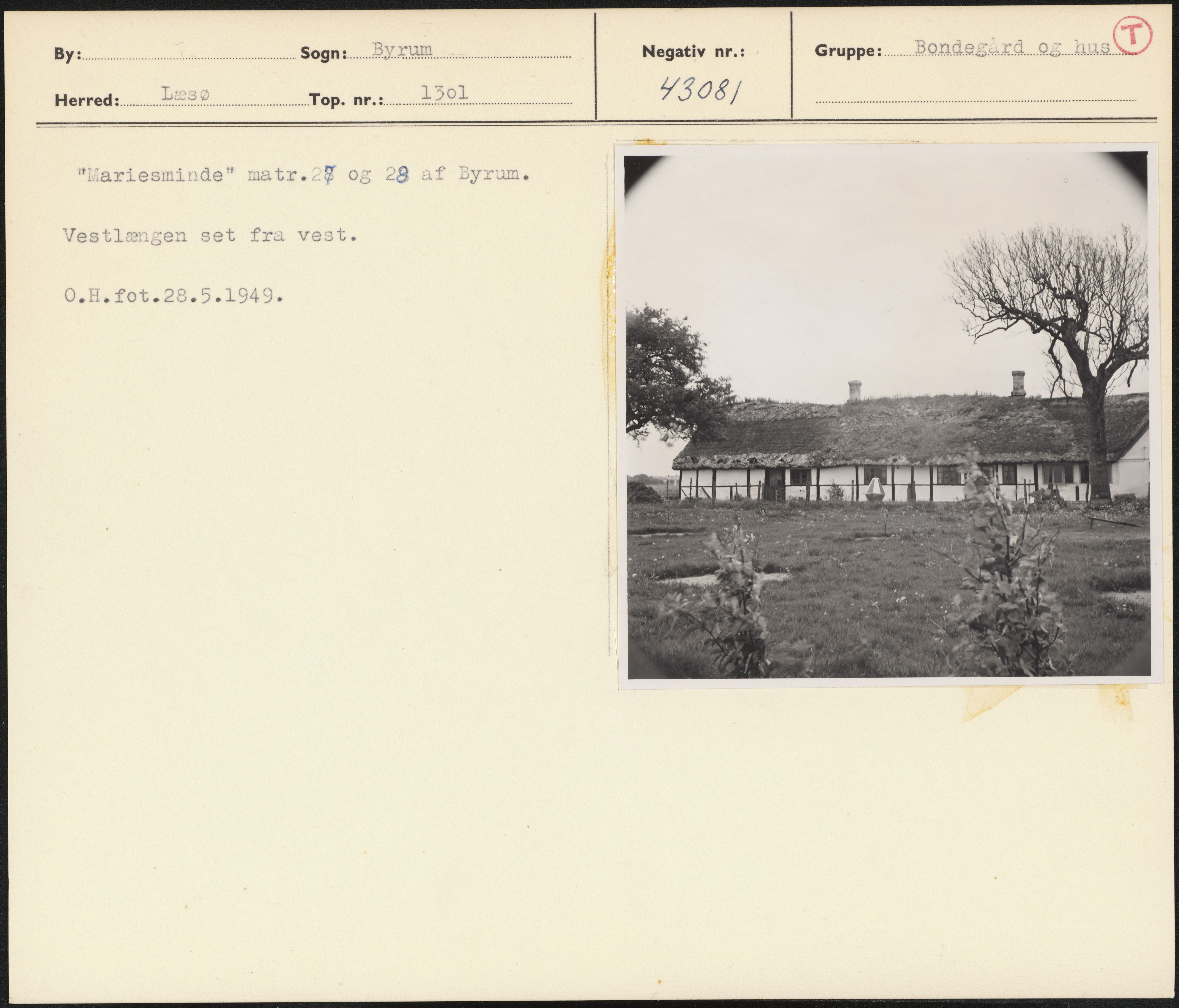 Maskingenkendt tekst fra arkivkort. lariesminde" matr. og 28 af Byrum. Vestlængen set fra vest. 0.H.fot.28.5.1949.