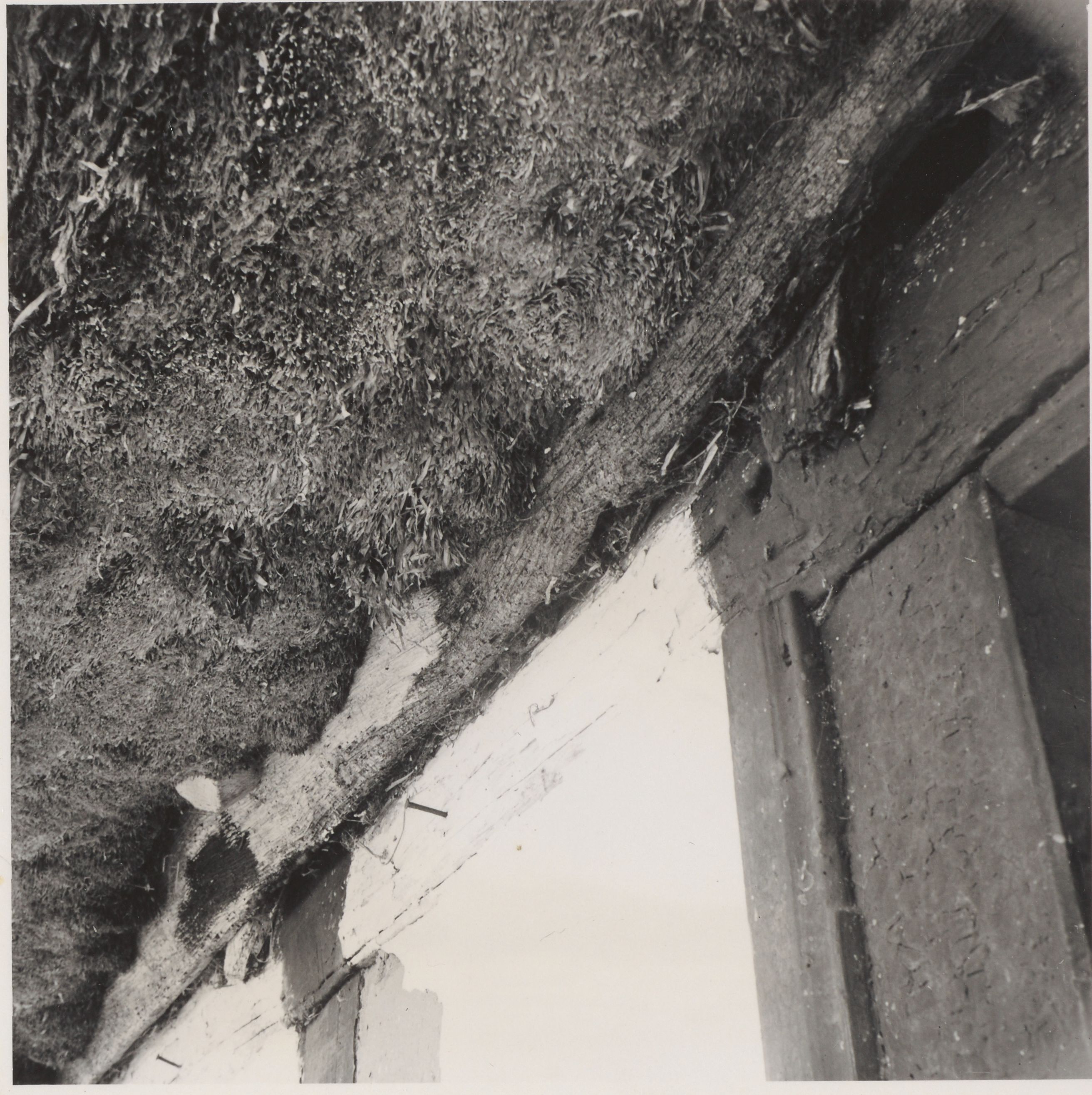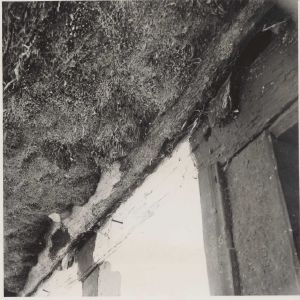 Maskingenkendt tekst fra arkivkort. Kratgard" matr.29 af Byrum. Nordsiden af nordlængen.Her er ved indgangstx døren bevaret et stykke med tangtag. lan ser enden af lodrette stave mellem rem og skokbord.Ingen skokknægte. 0.H.31.5.1949.
