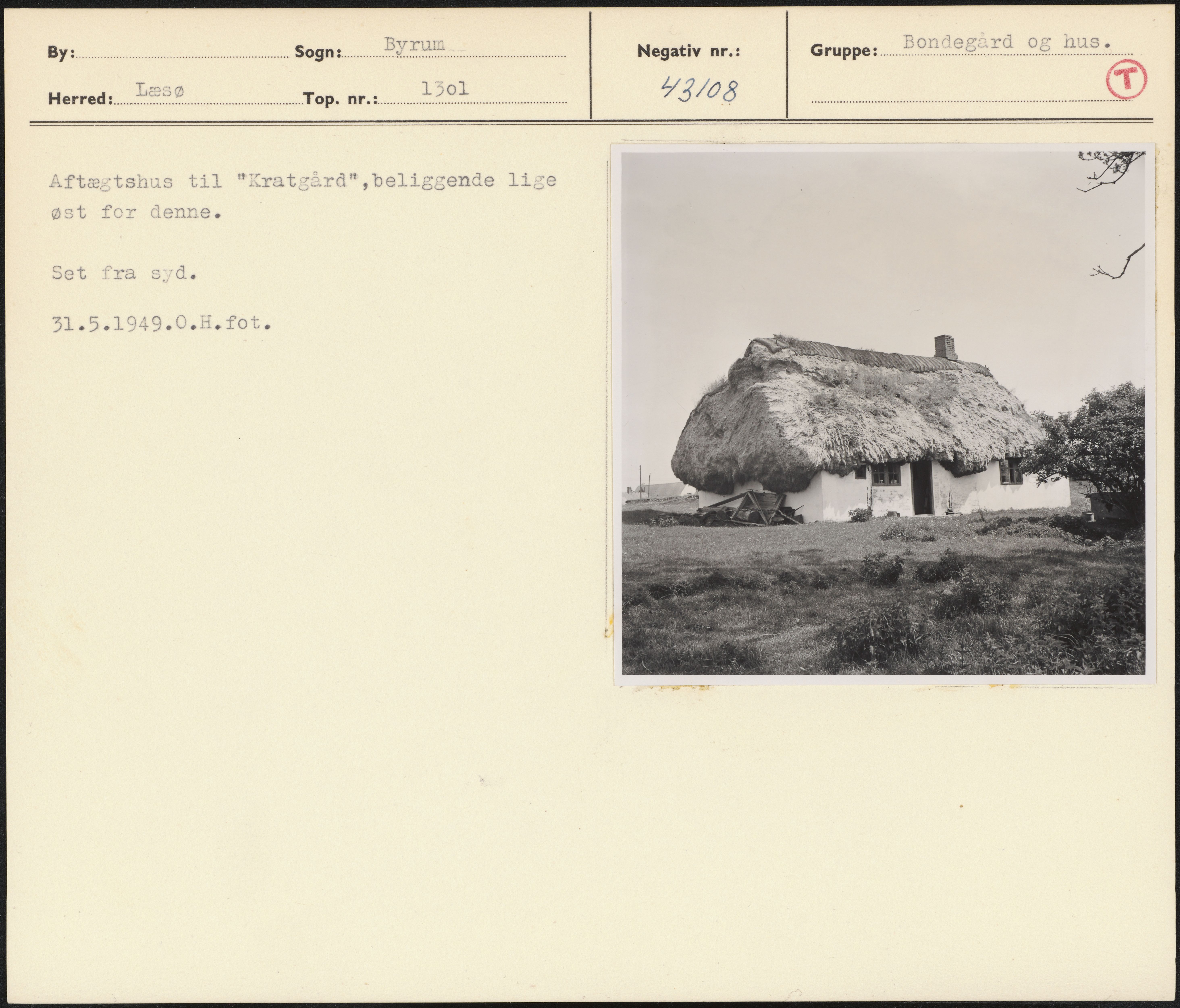 Maskingenkendt tekst fra arkivkort. Aftægtshus til "Kratgård",beliggende lige øst for denne. Set fra syd. 31.5.1949.0.H. fot.