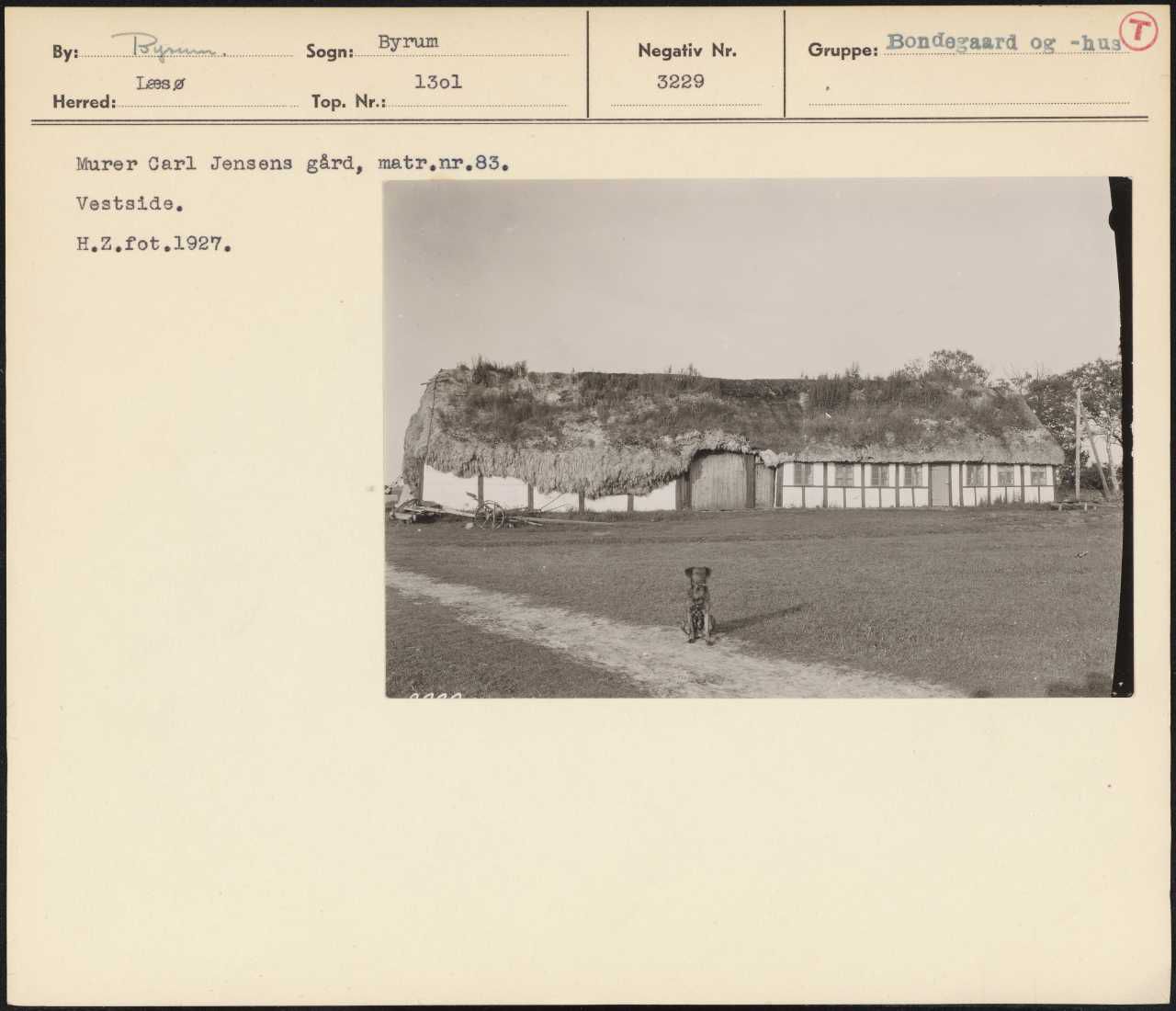 Maskingenkendt tekst fra arkivkort. Murer Carl Jensens gård, matr,nr.83, Vestside, H.Z.fot 1927.