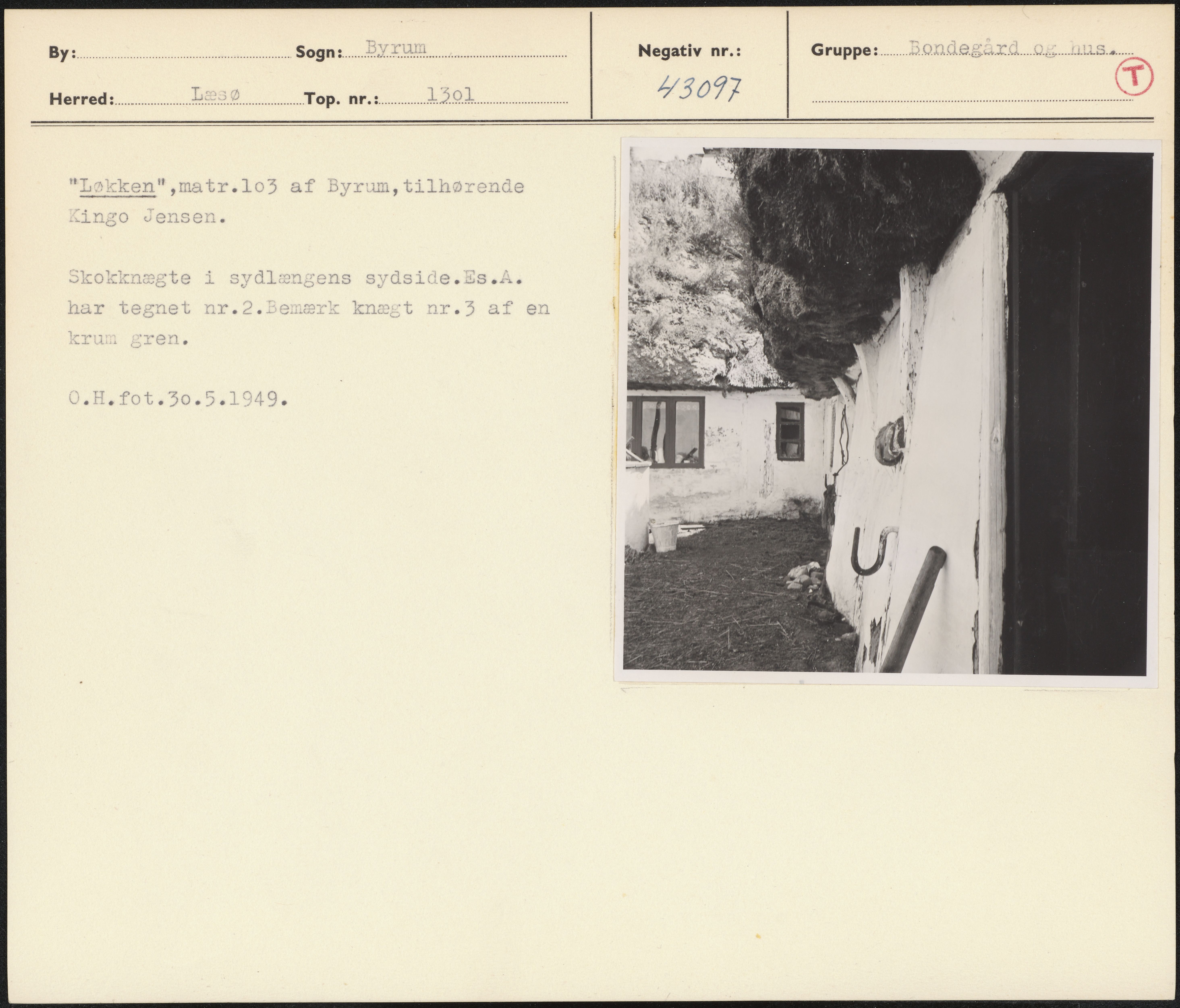 Maskingenkendt tekst fra arkivkort. Lokken",matr.lo3 af Byrum, tilhørende KZingo Jensen. Skokknægte i sydlængens sydside.Zs.A. har tegnet nr.2.Bemærk knægt nr.3 af en krum gren. 0.H.fot.30.5.1949.