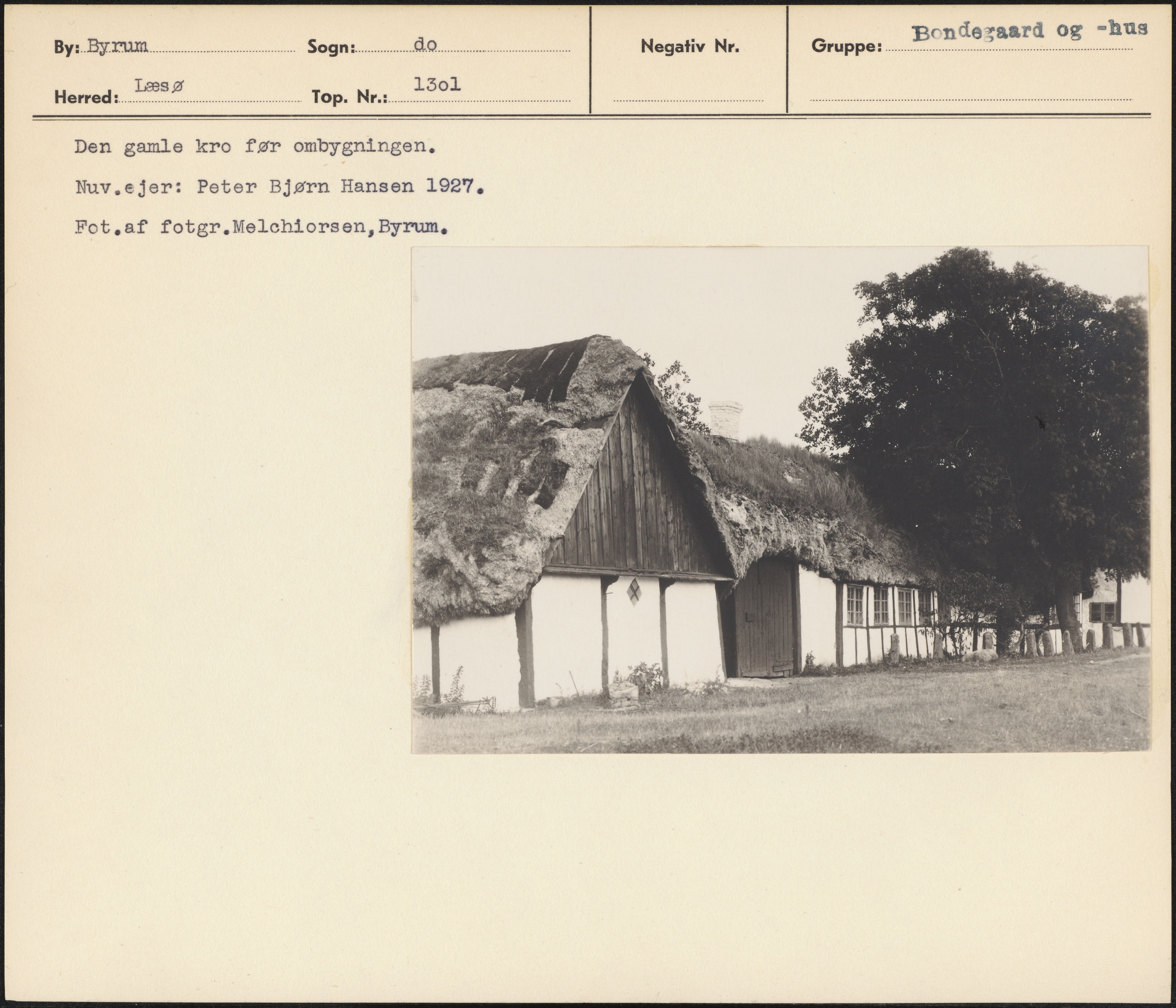 Maskingenkendt tekst fra arkivkort. Den gamle kro før ombygningen. v Nuv,ejer: Peter Bjørn Hansen 1927, Fot,af fotgr.Melchiorsen, Byrum,