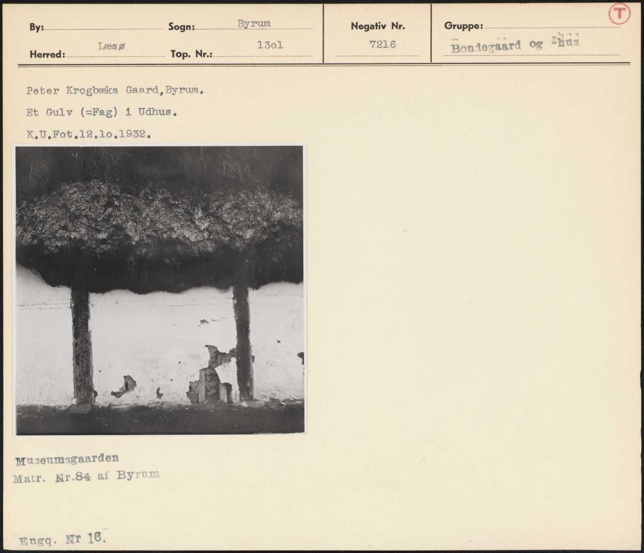 Maskingenkendt tekst fra arkivkort. Peter Krogbæks Gaard,Byrum, Et Gulv (=Fag) 1 Udhus, K.U.Fot .12,10,1932, Museumsgaarden Matr. Nr.84 af Byrvx mwneg. Nr 168.
