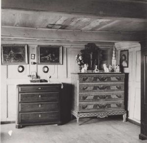 Maskingenkendt tekst fra arkivkort. Peter Krogbæks gård,Byrum. Storstuens østvæg. K.U fot ,1932. Muæumsgaarden Matr. Nr.84 a: By mm