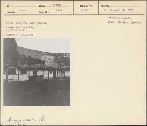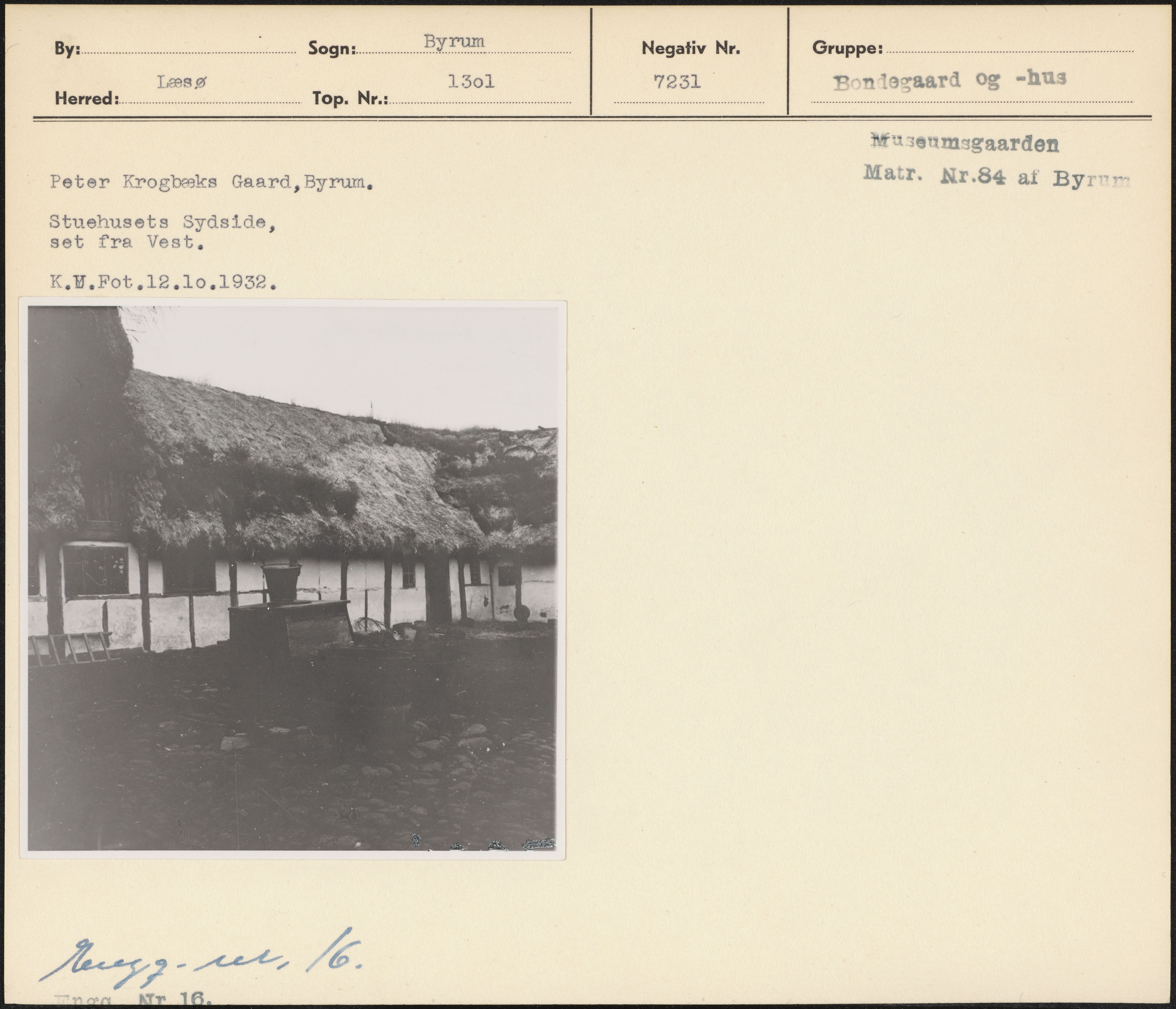 Maskingenkendt tekst fra arkivkort. Mujenmsgaarden Peter Krogbæks Gaard,Byrum, Mair. Nr.84 at Byrv» Stuehusets Sydside, set fra Vest, K.9Y.Fot ,12.10.1932. sg - et /6.
